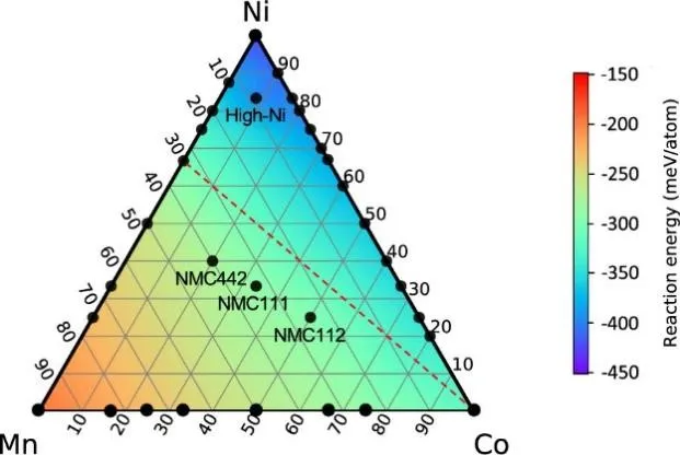 5Cl (LPSCl). The calculation results show that when the nickel content x value increases from 0.33 to 0.80, the interface reaction energy barrier decreases by about 0.4 eV, significantly increasing the activity of the interface side reaction. The reduction in Co content may increase the risk of side reactions. It is worth noting that the study quantified the interface stability trend (Mn > Co > Ni) by constructing a ternary phase diagram (Ni-Mn-Co) and pointed out that Li