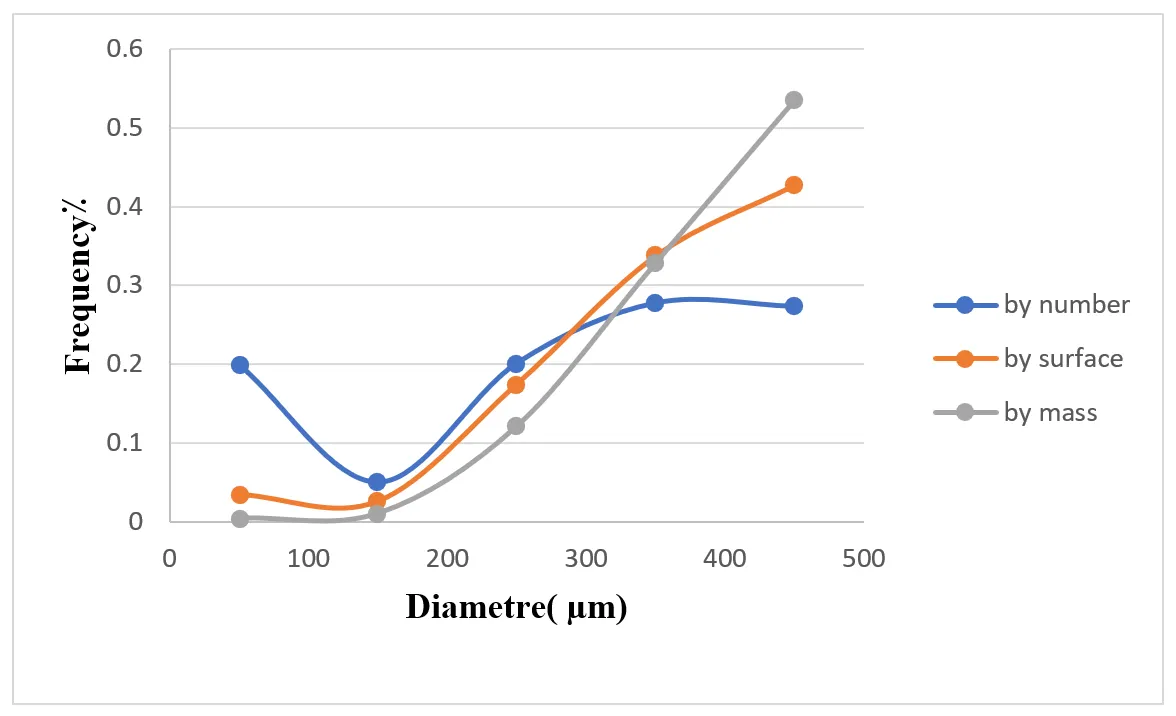 The manufacturing operating conditions have an impact on the particle system’s mechanical, chemical, and physical characteristics, which in turn affect this physical characteristic. A system is referred to as mono-dispersed if its constituent particles are all the same size. A system is referred to as poly-dispersed if its constituent particles are of varying sizes. An average diameter is used to represent the size of spherical particles. Depending on the methods employed, the literature displays a variety of diameter calculations. Three average diameters were utilized in this study to describe the size of the microparticles: by surface area, by number, and by volume. Using an optical microscope, observations reveal that the solvent evaporation method produces spherical particles of varying sizes.