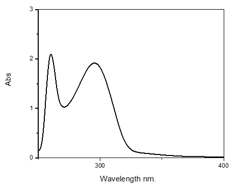 Two broad bands can be seen in the spectra. The absorption of electromagnetic radiation in the UV-Vis region is governed by electronic transitions between molecular energy levels, which directly influence the λmax values. Although multiple transitions are theoretically possible, only those involving the lowest energy levels contribute to absorption in this spectral range. In organic molecules, specific functional groups known as chromophores are responsible for these absorptions, as they contain conjugated systems capable of undergoing electronic excitation. Among these, the n → π