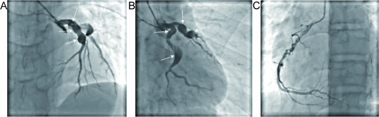 . Representative CAG images from Qilu Hospital in July 2022. (<b>A</b>,<b>B</b>) Giant CAAs (white arrows) at the proximal LAD and LCX with no distal stenosis. (<b>C</b>) Spiral meander at the middle segment of RCA with no obvious stenosis.