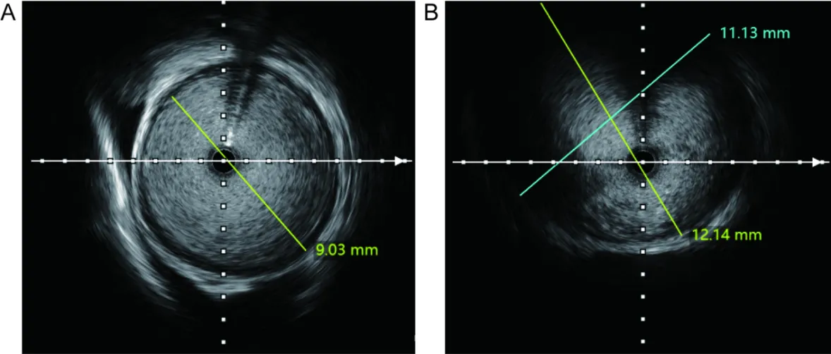 . Representative IVUS images of the giant aneurysms. (<b>A</b>,<b>B</b>) CAAs with about 9 mm in diameter in LAD and more than 12 mm in LCX with ambiguous boundaries.