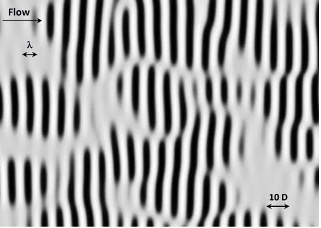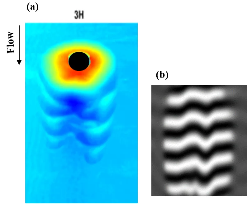 Experiments were carried out with a cylinder with a diameter D of 0.04 m, set vertically at equal distances from the channel side walls; the velocity of hydrodynamic flow is U = 0.16 m/s. Behind the cylinder, turbulent van Karman Street occurs because Reynolds number Re = UD/ν (ν is for kinematic viscosity of water) is sufficiently high Re = 6400.