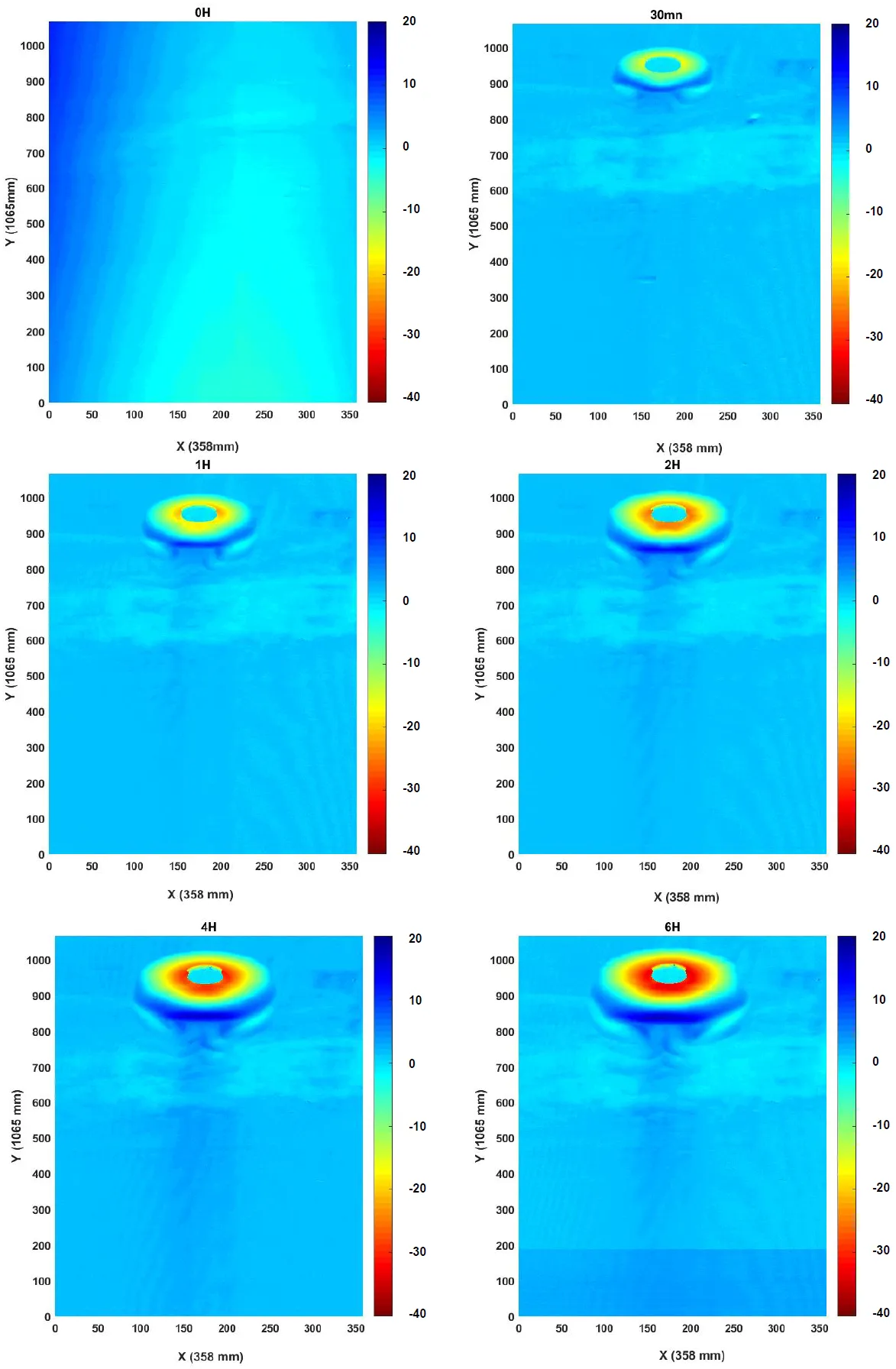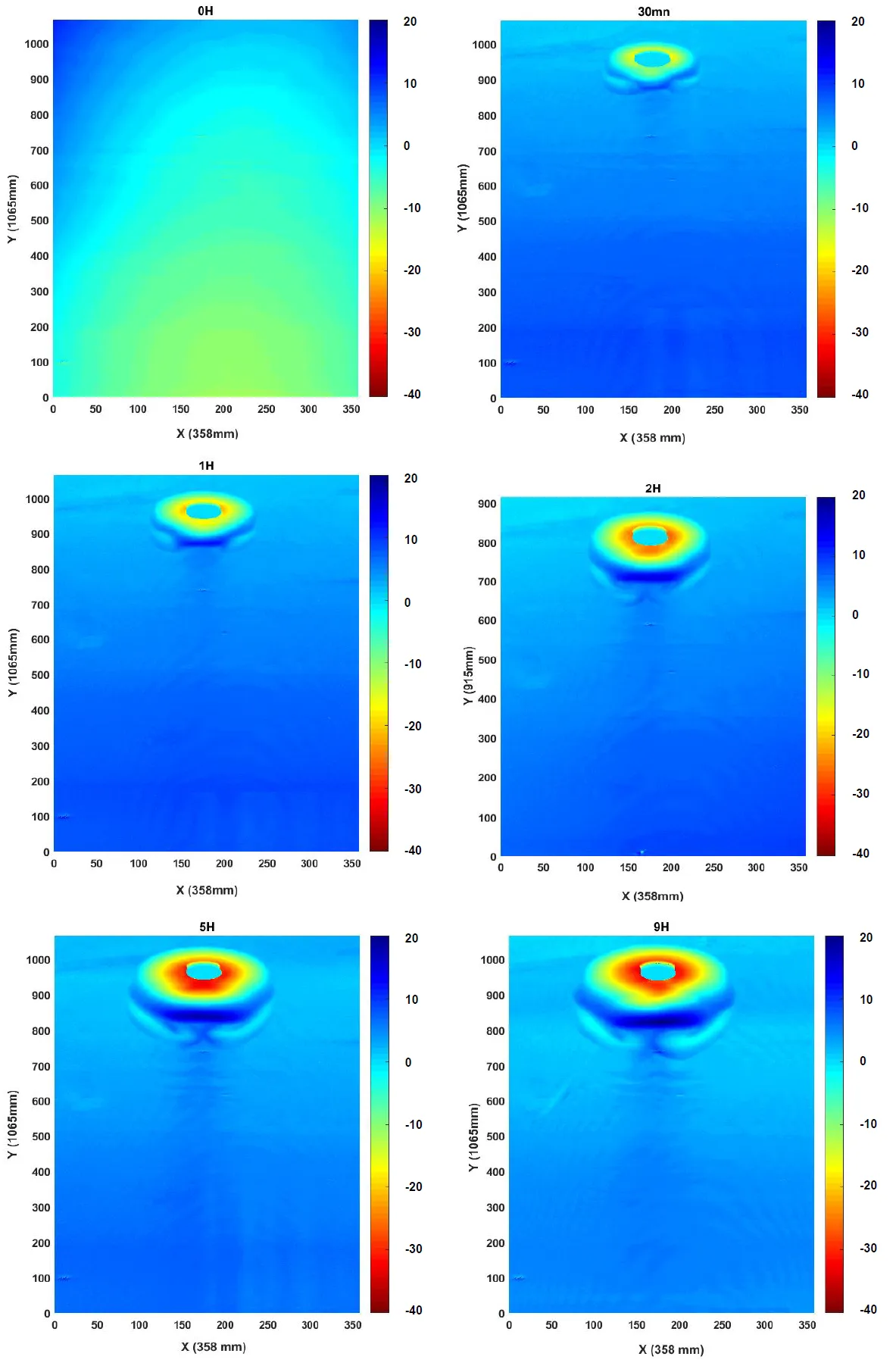 ). The temporal evolution of the sediment bed was reproduced and studied after flow durations of 30 min, 1 h, 2 h, 4 h, 6 h, 8 h and 9 h. The resulting morphologies were used to characterize the evolution of scour around the vertical cylinder and the ripples generated in the sand just downstream of the cylinder.