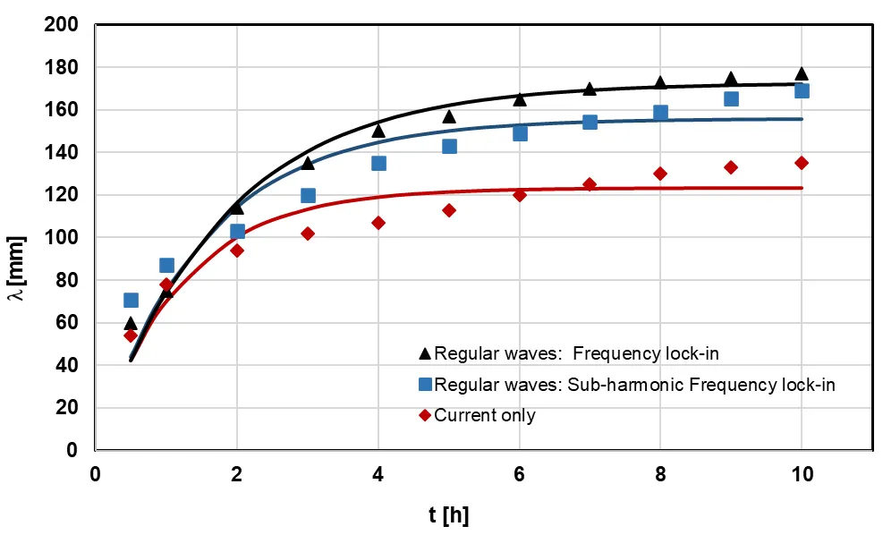 8]. At large amplitudes of surface waves, instead of sub-harmonic frequency lock-in regime in which the vortex shedding occurs at a frequency of surface waves arise. In this mode, there is a substantial restructuring of the vortex wake structure [