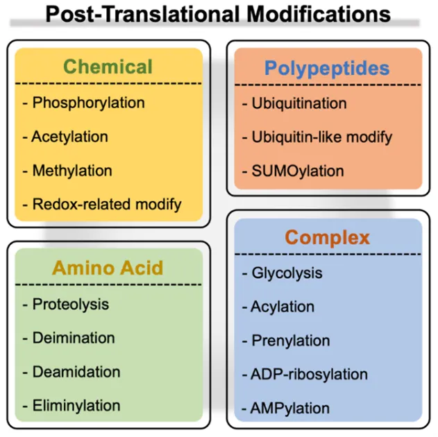 Eukaryotes, including plants and animals, undergo more complex PTMs, contrary to bacteria, which can only manage limited PTMs such as phosphorylation, acetylation, methylation, and thiolation [