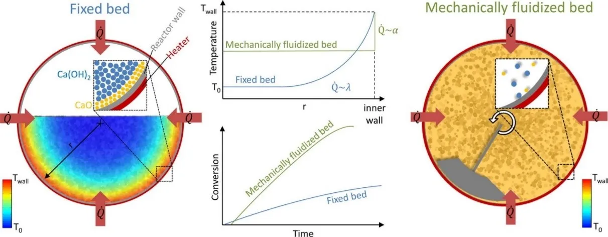 2-based thermochemical energy storage systems, with particular emphasis on fundamental mechanisms and performance enhancement strategies. Key aspects analyzed included the reaction thermodynamics and kinetics, with particular attention to the hysteresis behavior observed in hydration and dehydration cycles and its dependence on the partial pressure of water vapor. Material engineering approaches to mitigate sintering, including nanostructuring, porous matrix stabilization, and surface functionalization to accelerate ion diffusion, were discussed. Reactor-level thermal-fluid synergies, encompassing reactor configurations with quantified heat transfer coefficients and the optimization of residence time, were also included in this review. Cyclic stability and sintering kinetics, which are crucial to the reaction and heat transfer, were summarized, highlighting that operating stresses, both thermal and mechanical, reduced effective capacity due to pore collapse and active site deactivation. Finally, techno-economic barriers to commercial deployment were discussed, with hybrid systems coupling thermochemical energy storage with latent heat storage proposed as a transitional strategy.