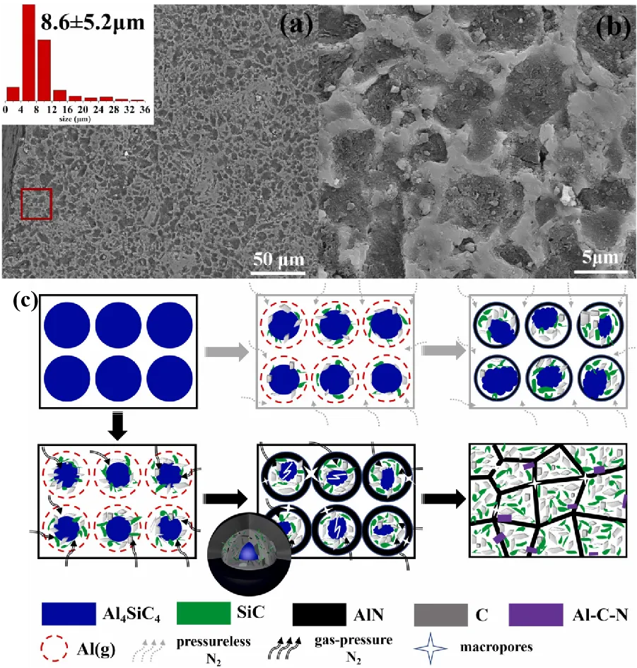 . BSE images of specimens heat-treated at (<b>a</b>,<b>b</b>)1700 ℃ and Reaction model illustration for the formation of AlN-SiC-C (<b>c</b>) [