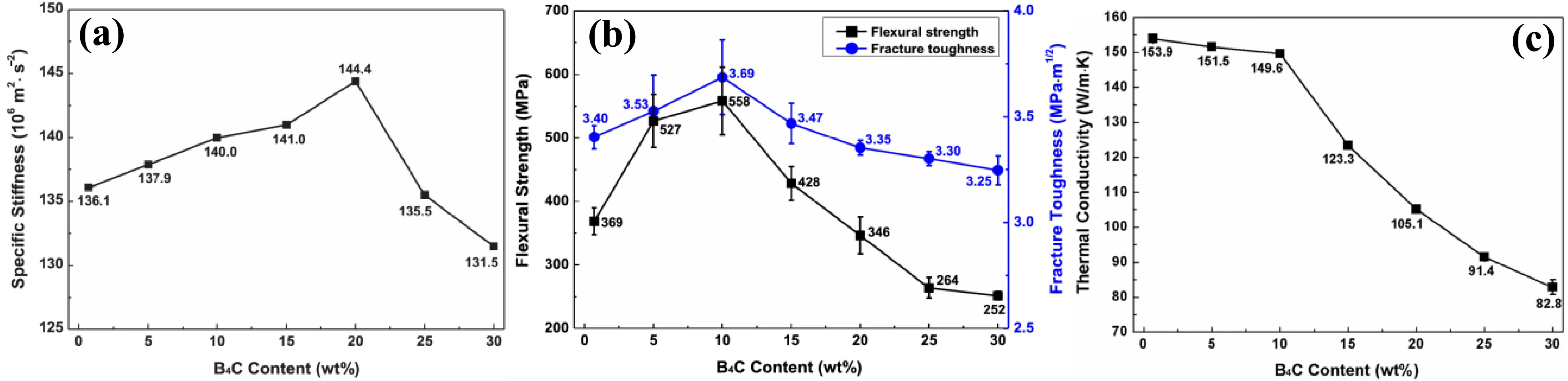 . (<b>a</b>) Specific stiffness of SiC ceramics as a function of the B<sub>4</sub>C content; (<b>b</b>) Flexural strength and fracture toughness of SiC ceramics as a function of the B<sub>4</sub>C content; (<b>c</b>) Thermal conductivity of pressureless-sintered SiC ceramics as a function of the B<sub>4</sub>C content [