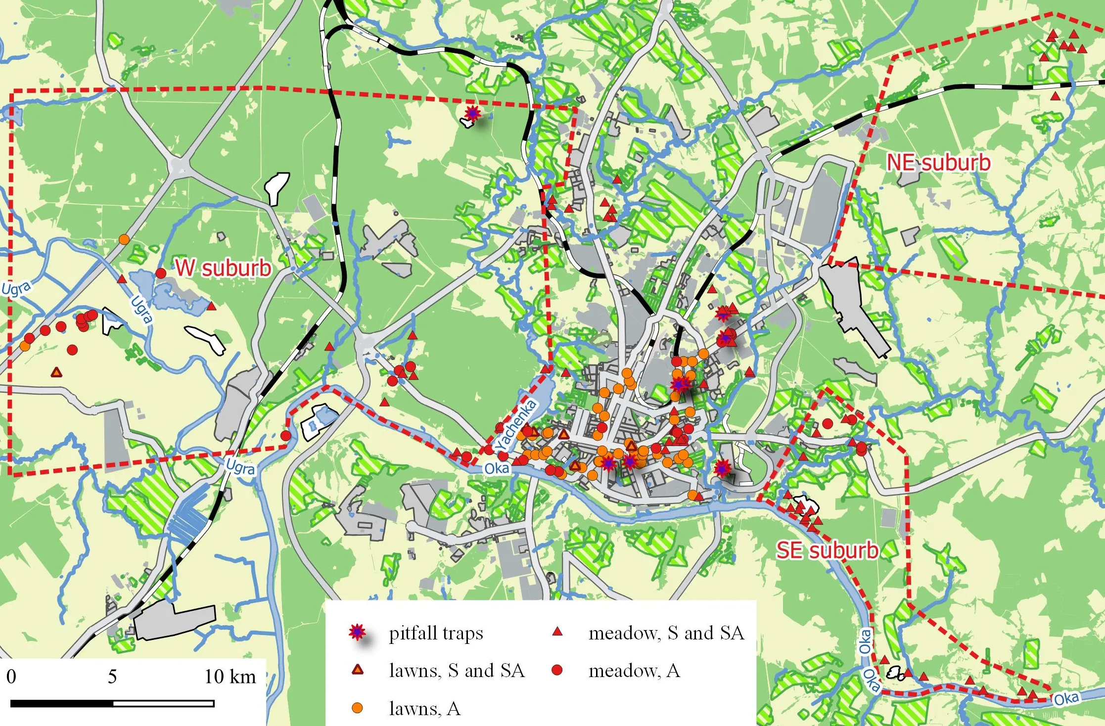 The north and northwest city peripheries and suburbs do not have large meadows; in these areas, industrial and residential buildings are alternated with secondary deciduous forests, making it difficult to find suitable sample plots. Through their landforms and forest vegetation, these lands resemble the northeast suburbs. In the south, the Oka River is the natural boundary of the urban landscape. Large meadows along this river within the Kaluga city are absent; the bank is mainly populated by willows and box-elder. On the right bank of the river, there are also built areas of Kaluga, but we regard them as separate small urban landscapes and do not include them in this research.