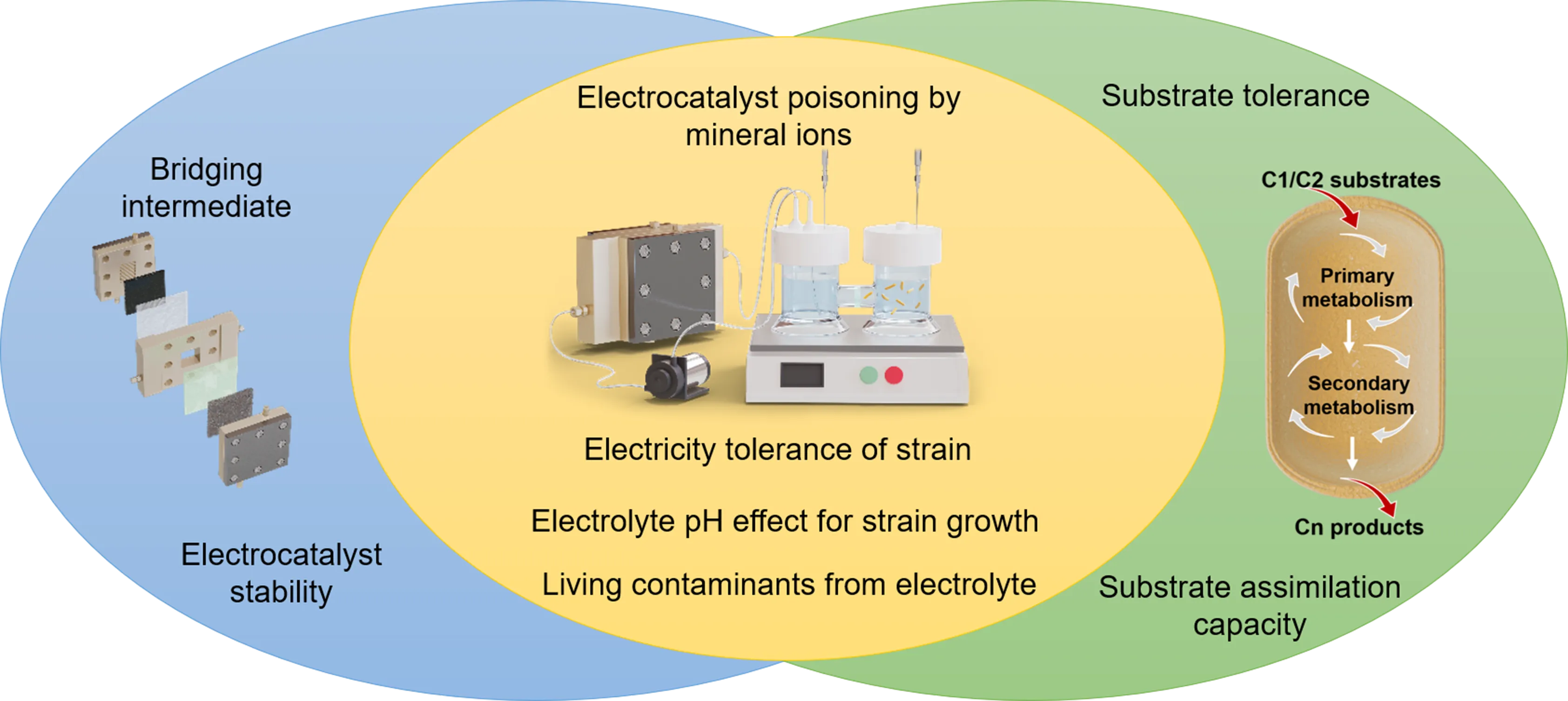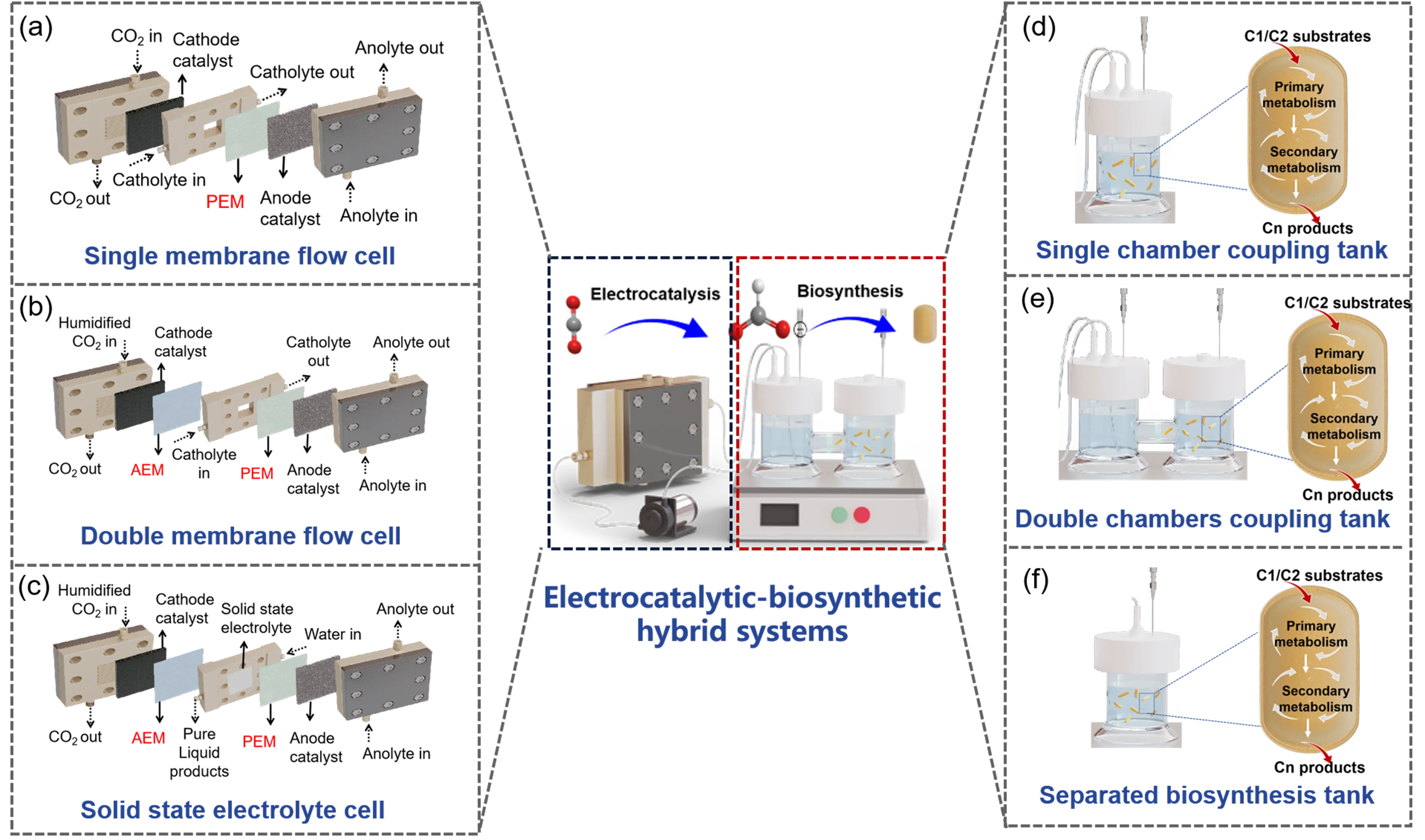 2 fixation. We aim to provide a better understanding of the compatibility and adaptability between electrocatalysis and biosynthesis modules and guide the construction of electrocatalytic-biosynthetic hybrid systems. First, the progress achieved in each individual module is outlined respectively. Then, the key factors that would affect the integration of electrocatalytic and biosynthetic processes are discussed in detail via single-module and cross-interference analysis. Finally, several coupling strategies are proposed to guide the construction of hybrid systems.
