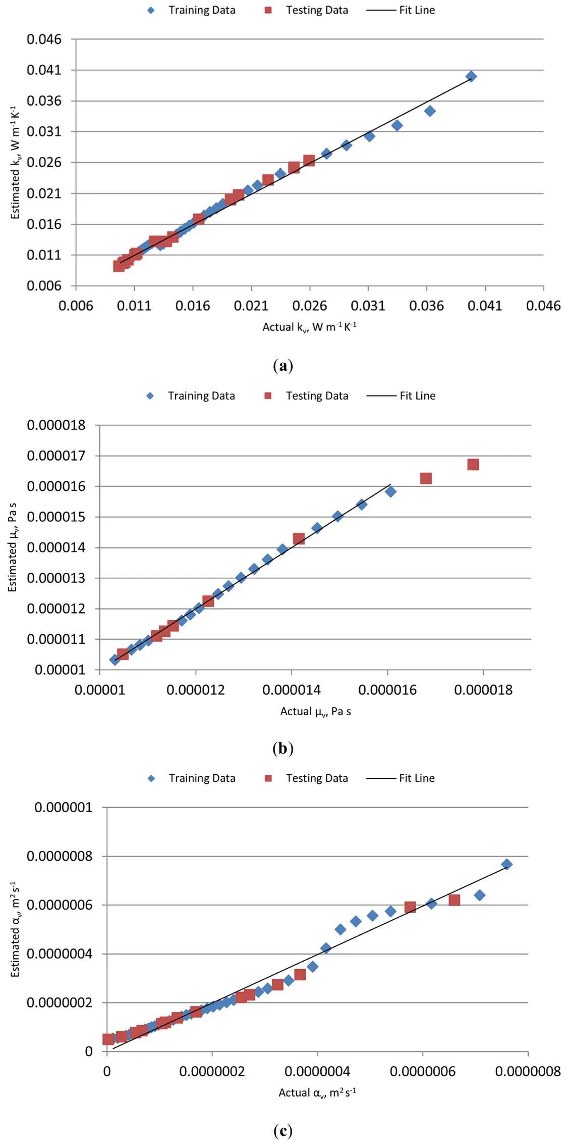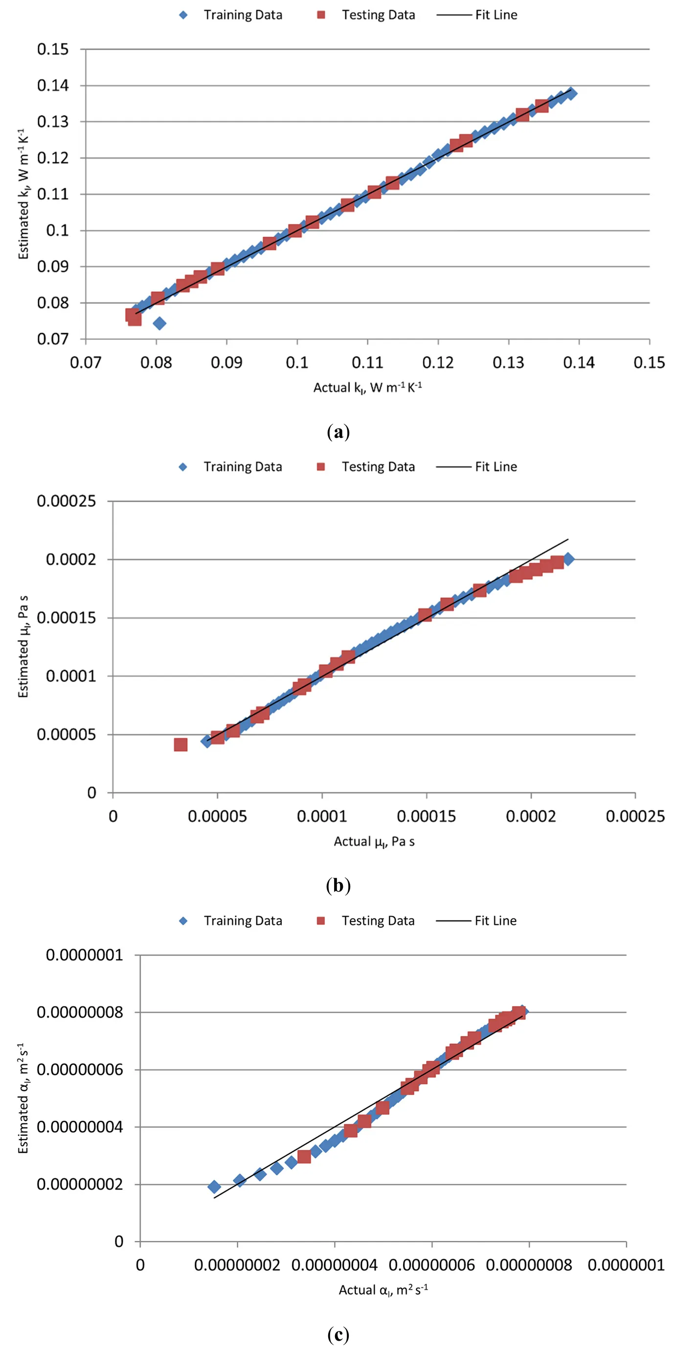 25] developed a neural network designed to compute the liquid thermal conductivity of diverse low-GWP refrigerants. Specifically, a feed-forward network algorithm utilizing 5 input parameters (reduced temperature, critical pressure, acentric factor, molecular weight, and reduced pressure) and a single hidden layer was applied to an extensive dataset of 3404 experimental data points for 7 halogenated alkene refrigerants. Rathod et al. [