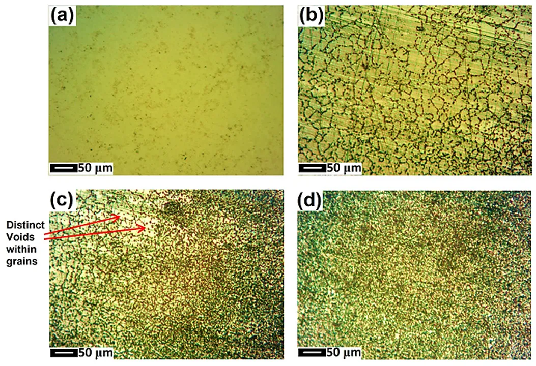 In the final stage, oxidation progresses in the remaining areas of the grains. d illustrates the last step of oxidation, wherein more regions of the grains undergo degradation due to high-temperature oxidation. This process continues until the voids cover the entire surface of the sample.