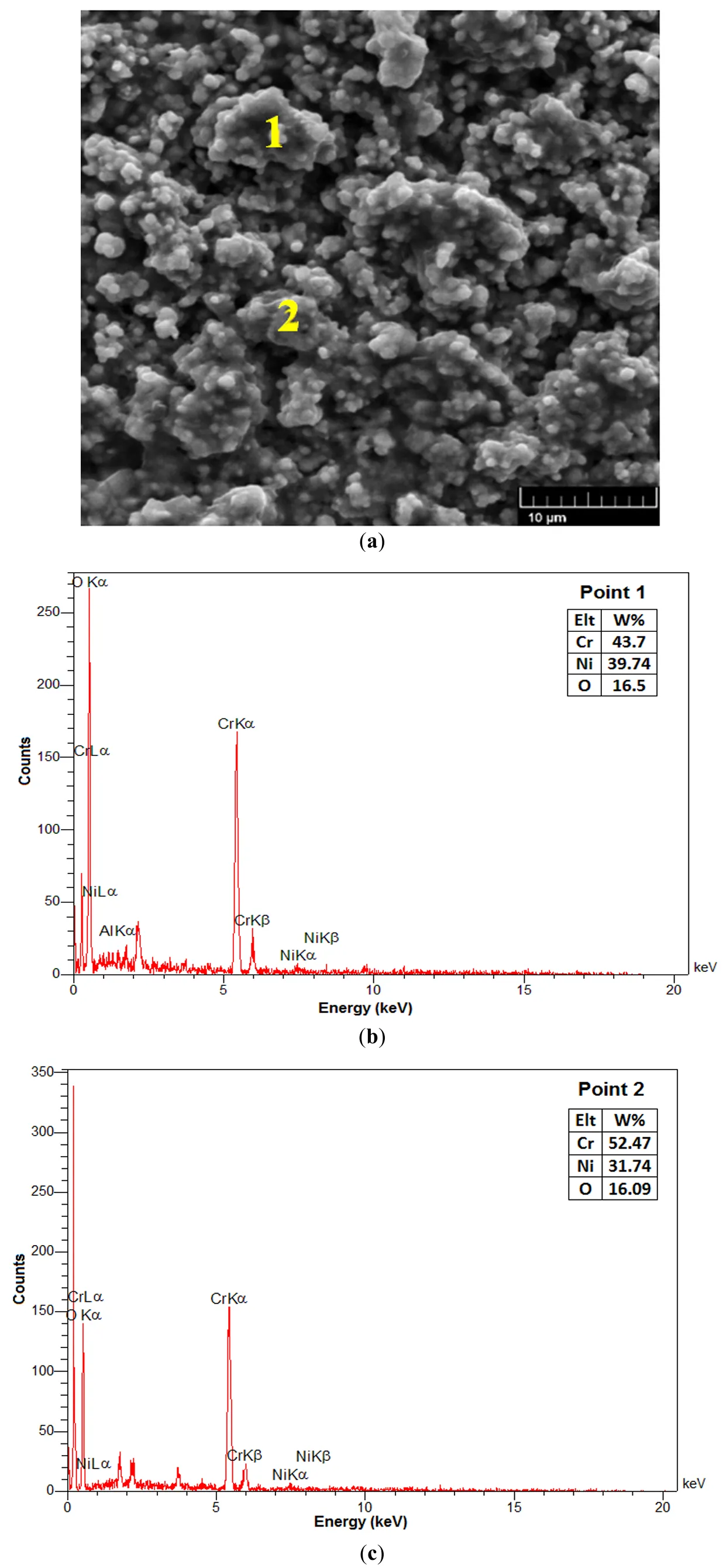 b,c. These point analyses were performed on the oxidized sample of MA 754 following a 100 h cyclic oxidation test at 1100 °C. The results reveal the presence of Ni, Cr, and O elements within the oxide pyramids. Considering the XRD pattern (