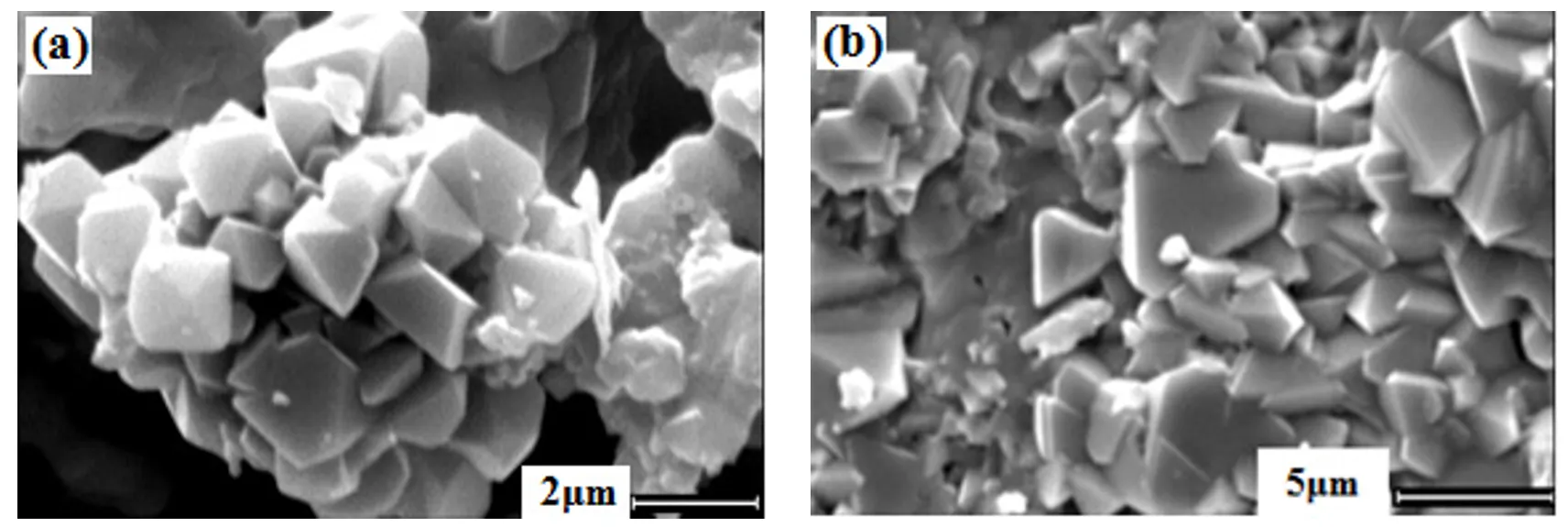 To provide a more comprehensive understanding of the morphology of oxide clusters, higher-magnification images are presented in . These images depict the morphology of spalled oxides and the oxidized sample after a 50 h cyclic oxidation test at 1100 °C. The SEM micrographs reveal a pyramidal-type morphology characterized by flat faces. Notably, each oxide cluster exhibits a flower-like structure composed of numerous oxide pyramids. In addition, the pyramidal oxides observed in are remarkably small, with approximate dimensions below 6 μm.