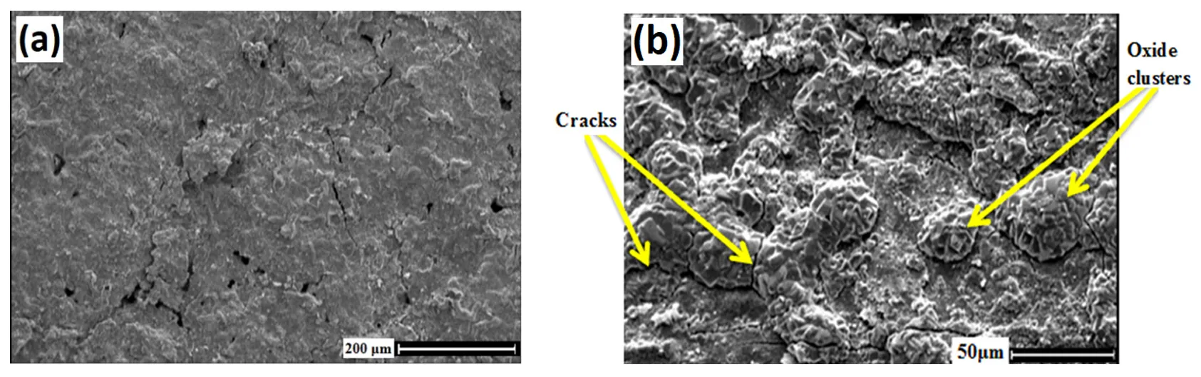 . The observed image reveals a porous and extensively cracked oxidized surface. The occurrence of cracks serves as an indication of stress concentration within the oxide scale [