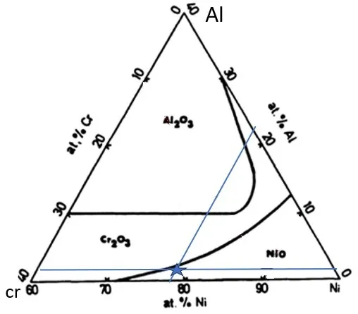 depicts the oxide map corresponding to a ternary Ni-Cr-Al system at a temperature of 1100 °C. This diagram encompasses three distinct regions. The position of MA 754 within this superalloy is determined by the atomic percentages of Ni, Cr, and Al in its chemical composition. The star symbol in