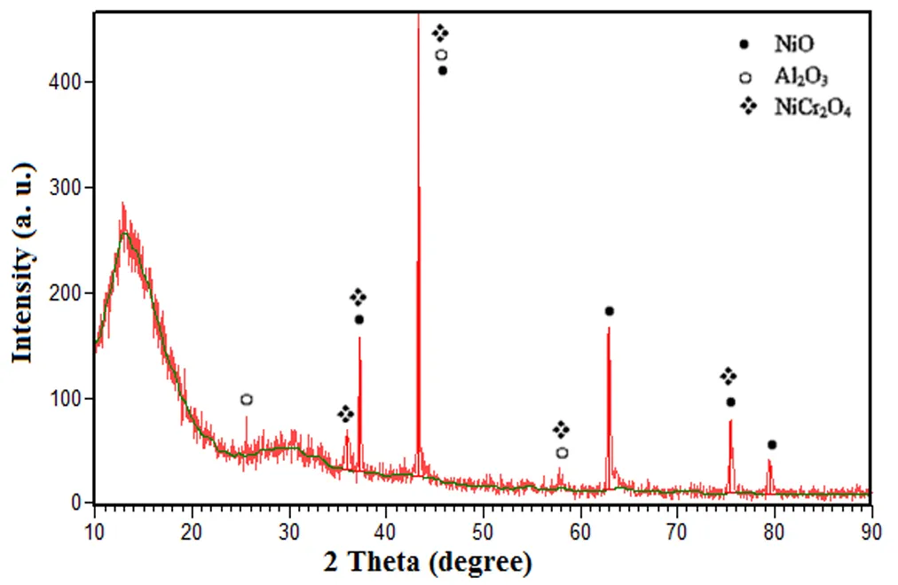 presents the XRD spectra depicting the spalled oxides of MA 754 superalloy following 100 h of cyclic oxidation at a temperature of 1100 °C. The obtained results reveal that the oxidation products of this Inconel alloy primarily consist of NiO and NiCr