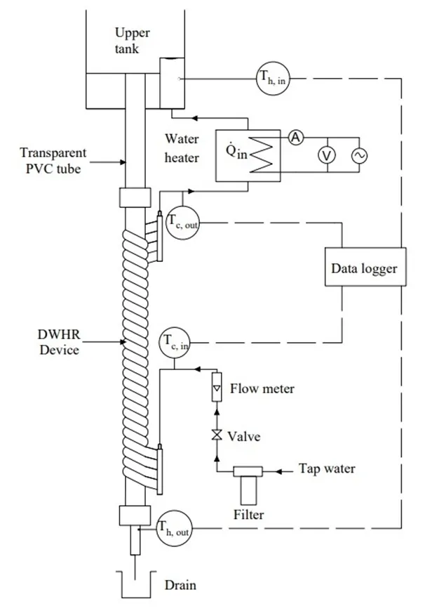 illustrates the setup employed to measure the dynamic performance of the DWHR device. The setup includes a DWHR unit connected to an open water circuit designed to mimic a real residential system installation. The experiments were conducted using tap water. However, in real installations, grey water is typically used as the hot water source. The DWHR device comprises a 3-inch nominal copper drainpipe, where hot water forms a film on its inner surface. The DWHR device comprises a 3-inch nominal copper drainpipe, where grey water forms a film on its inner surface. Four parallel copper helical coils carry cold water are wrapped around the drainpipe, which is heated by the hot grey water. Prior to the cold inlet, a flow meter and inline cartridge filter are installed. The temperature of the cold inlet is measured using a K-type thermocouple, while another thermocouple records the cold outlet temperature. An electric tankless water heater, equipped with two 3-kW heating elements and a power input range of 1–6 kW, is used to elevate the flow temperature. The heated water enters a partition in the upper tank, ensuring steady laminar flow and reducing turbulence as it enters the central drainpipe. A transparent PVC tube allows for visual observation of the hot water flowing into the DWHR hot inlet. Thermocouples are employed to measure the hot inlet and outlet temperatures, and a data logger records temperature readings.