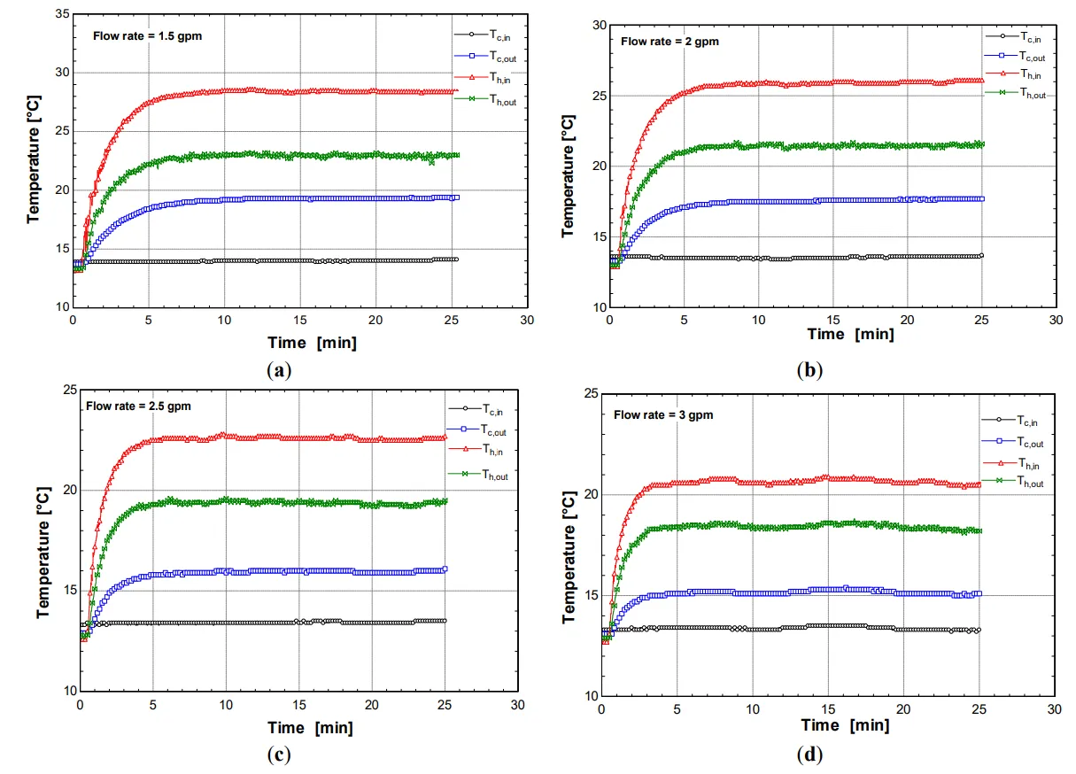 . Temperature response at a flow rate of (a) 1.5 gpm, (b) 2 gpm, (c) 2.5 gpm, and (d) 3 gpm.