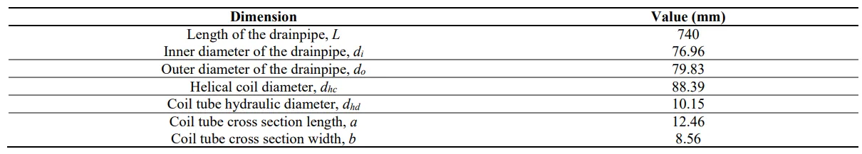 displays the major dimensions of the tested DWHR device, with corresponding values listed in Table 1. Prior to each experimental run, cold tap water was circulated through the device for 15 min until a thermal balance was achieved within the system. The electric water heater was then activated at a constant flow rate, and temperature measurements were recorded every 1 second for a duration of 25 min, until a steady-state condition was reached, indicated by no further temperature changes. The collected temperature data of the hot and cold fluids were analyzed to evaluate the dynamic performance of the DWHR device.