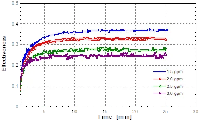 The collected temperature-time data, along with the water flow rate and heat input, were utilized to assess the transient performance of the DWHR device. Using the analysis discussed earlier, both the instantaneous and actual effectiveness were calculated. illustrates the temperature-time variations at flow rates of (a) 1.5 gpm, (b) 2 gpm, (c) 2.5 gpm, and (d) 3 gpm. As depicted in the figure, the outlet temperatures do not respond instantaneously to the heat input, and the response time differs based on the flow rate. The heat supply is positioned just before the inlet hot temperature, resulting in a sudden temperature increase. However, the cold-water outlet temperature gradually increases until reaching a steady state due to the thermal inertia of the device. At higher flow rates, the steady-state temperature of the outlet hot water is lower due to the increased heat transfer rate between the hot and cold fluids.