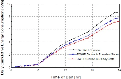 . Cumulative daily energy consumption comparison of a water heater with and without a DWHR device under steady and transient operations.
