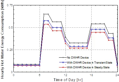 presents the hourly energy consumption of a high-efficiency electric water heater, comparing the scenarios with and without a DWHR device under both transient and steady-state conditions, considering the combined usage of the sink and shower. It is evident from the figure that the inclusion of a DWHR device leads to a reduction in energy consumption.