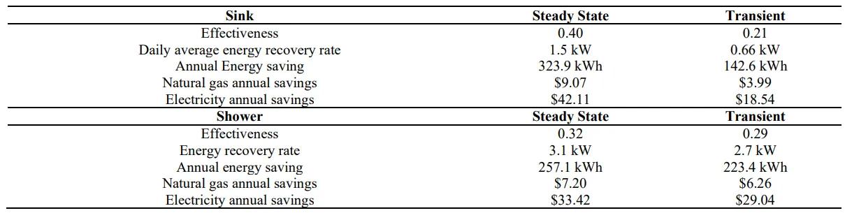 displays the effectiveness, energy recovery rate, and annual savings achieved by the DWHR device in both steady-state and transient conditions. Assuming an electric water heater, under fully steady-state conditions, the device yields an annual savings of $75.53. However, considering the likelihood of the device operating in the transient state, the annual savings decrease to $47.55, resulting in a reduction of 37% in annual savings. It is worth noting that these results are based on a three-occupant house, and the annual savings are expected to increase with a greater number of occupants.