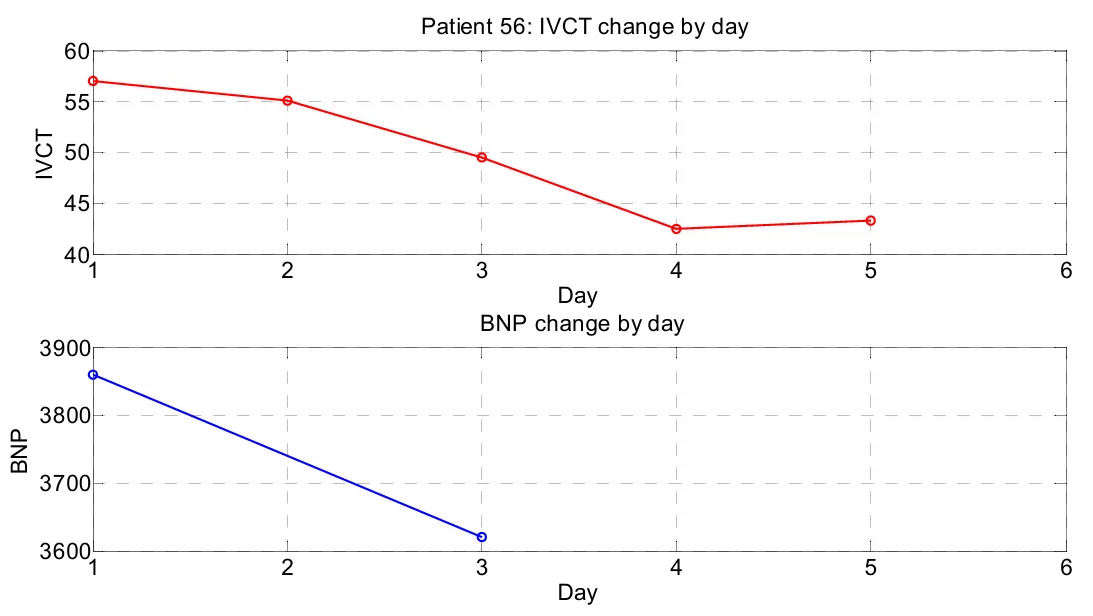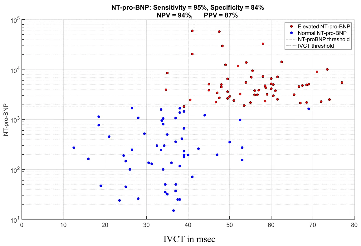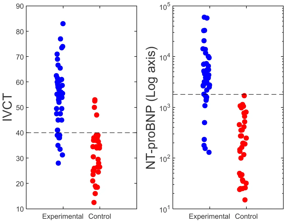 The mean initial NT-proBNP for the experimental arm (47 patients) was 8319 pg/mL, and the mean IVCT was 53 ms. For the control arm (50 patients), the mean initial NT-proBNP was 362 pg/mL, while the mean IVCT was 32 ms. ().