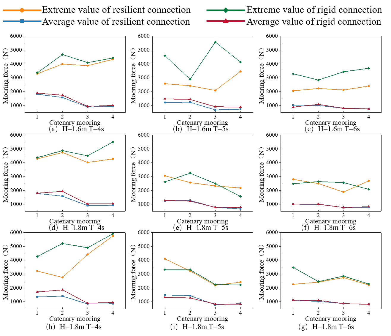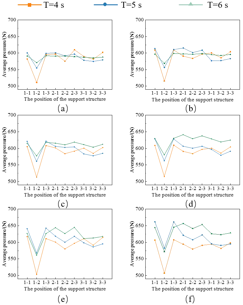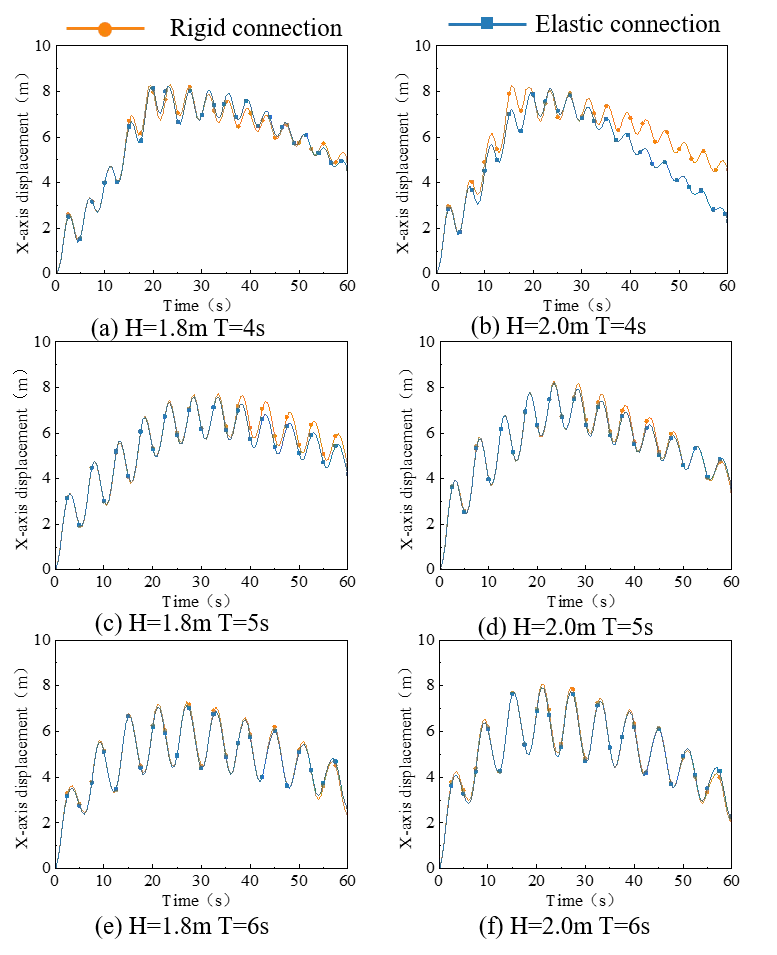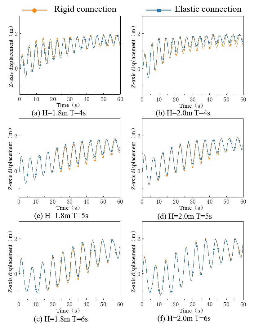 An orthogonal experimental design approach is employed to investigate the hydrodynamic behavior of OFPV with different types of connections under varying wave conditions. Wave height parameters range from 1 m to 2 m in 0.2-meter increments, and wave periods are 4 s, 5 s, and 6 s. The analysis focuses on the motion responses and mooring force characteristics of the floating structures. Comparative analysis is conducted between the OFPV with elastic and rigid connection structures under different wave conditions. The orthogonal design experiment () includes a total of 36 working conditions, with each working condition lasting for 60 s. Detailed working conditions refer to .