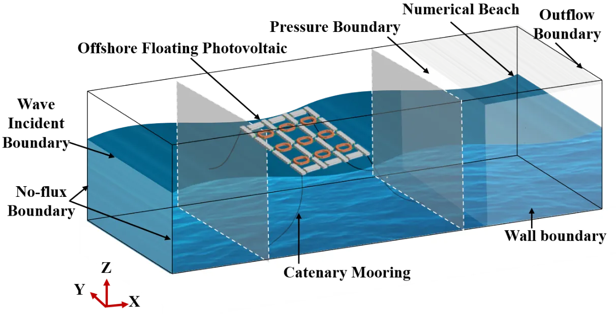 Max is defined as the free Outflow boundary. The length of the numerical beach should be set to at least two wavelengths to prevent the occurrence of reflected waves. The numerical beach technology is adopted for wave dissipation. Given the extended length of the numerical wave tank, the bottom boundary Z