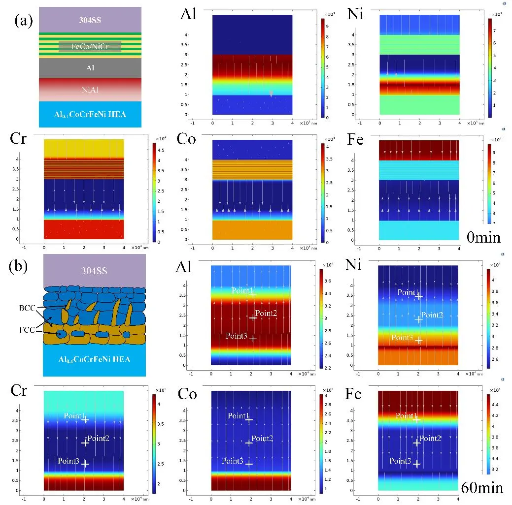 In this paper, a novel brazing process for joining HEAs joints at lower temperatures that judiciously stacks three functionally distinct multilayer nano-films with discrepancies in essence and functionality, specifically the auxiliary heating layer, HEAfs layer, and Al film (filler metal). The nano multilayer self-propagating exothermic reactive brazing has the features of low ignition temperature, fast reactive velocity, and little influence on BM to meet this demand. Therefore, more and more attention has been paid to the nano-multilayer self-propagating exothermic reactive brazing. However, it is difficult to observe the dynamic process and diffusion mechanism of the structural transformation of welded components by traditional experimental methods. The time scale and length scale of COMSOL finite element simulation are the same as those of the self-propagating reactive brazing experiment, which can accurately simulate the diffusion behavior and phase transition mechanism of the self-propagating reactive brazing process of nano multilayer films. So it plays a significant role in the research of self-propagating reactive brazing.