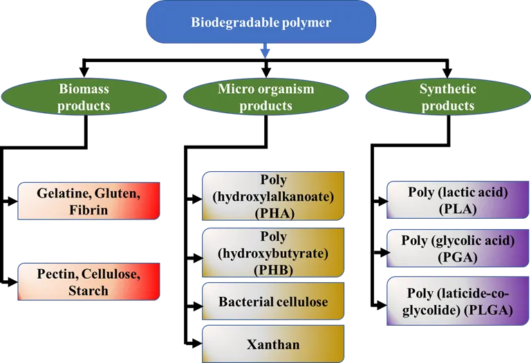 The classification of biodegradable polymers can be done on the bases of their origin, synthesis method, chemical composition, and applications. Broadly, they can be classified based on their origin as (1) natural polymers which are derived from renewable recourses like plants, animals, and microbes; (2) biodegradable polymers synthesized from petrochemicals products [