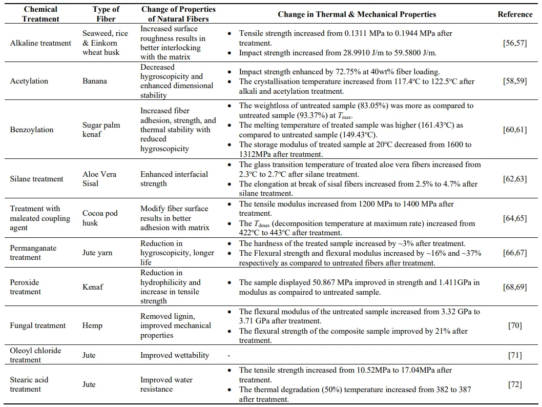 29]. To overcome these shortcomings, the natural fibers are subjected to biological, physical, and chemical treatments to remove impurities and improve water resistance, mechanical properties, and interfacial bonding with the composite matrix. Pannu and his team [