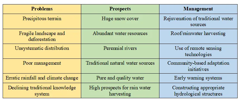 The study raised two main research questions: (1) What are the major sources of water in the Himalayan region, (2) what are the traditional methods of water conservation? and (3) how can these water sources be utilized to provide a proper water supply in both on and off seasons? The primary objectives of this study are to assess the potential of water resources, analyze usage patterns from both traditional methods and modern water supply systems, and propose comprehensive policy measures for the sustainable use of water resources in this region of abundance and scarcity. The study hypothesizes that rejuvenating traditional natural water sources will sustain the water supply and help mitigate the impacts of climate change.