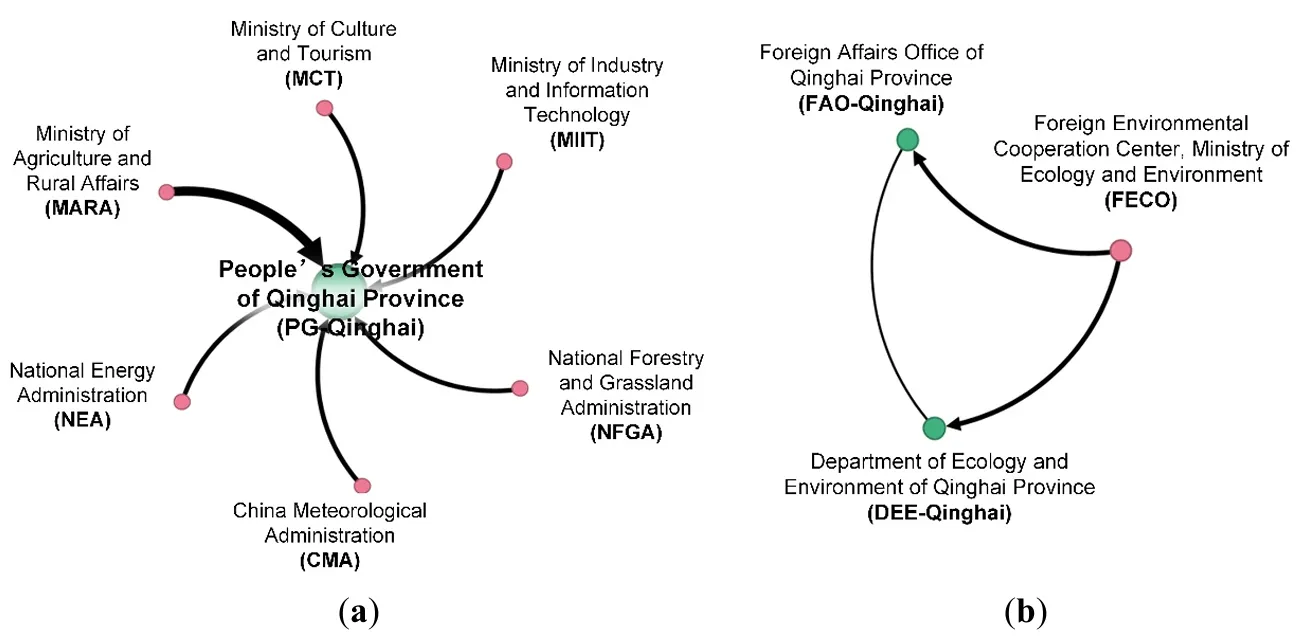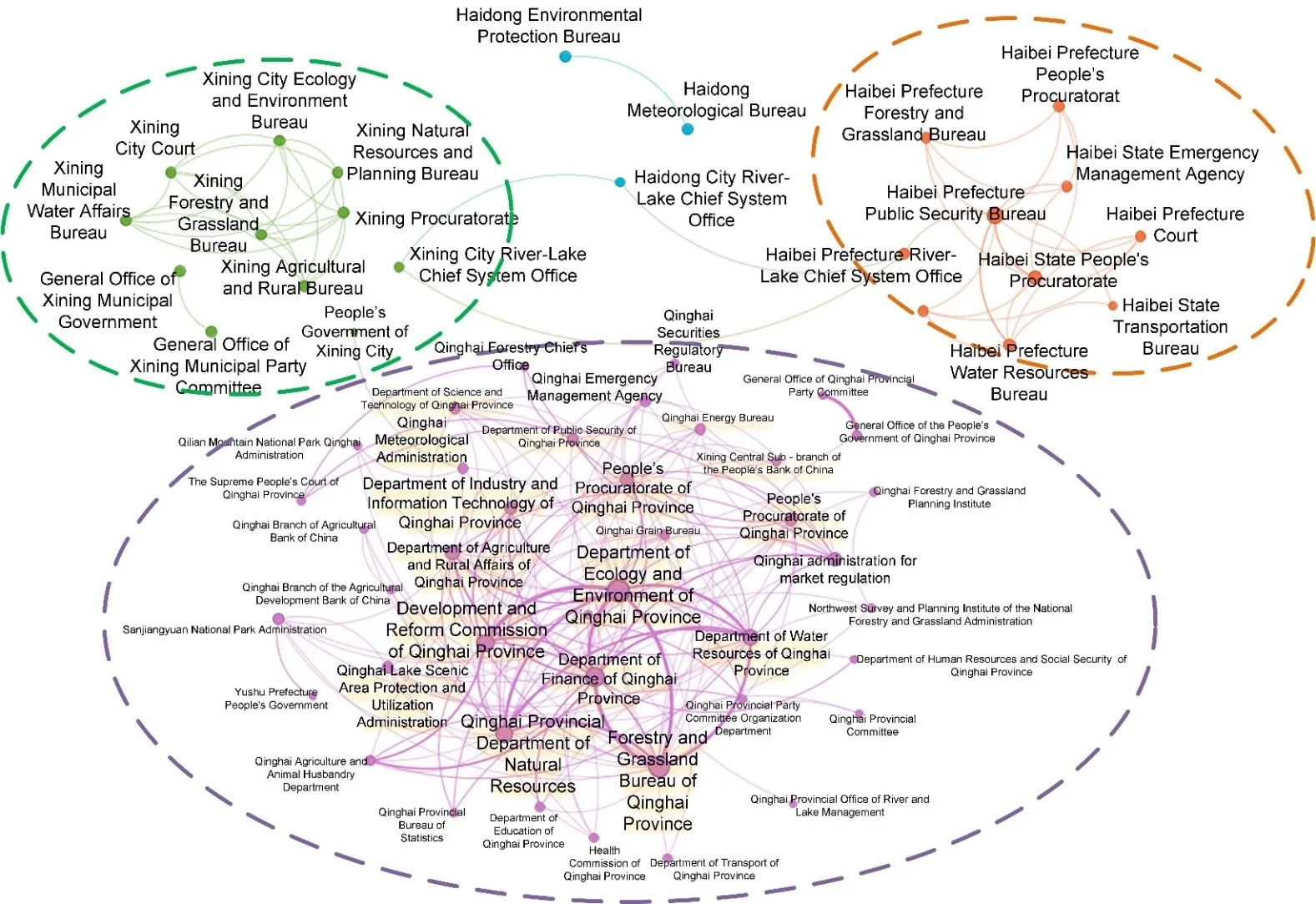 At the provincial level, a crisscrossed cooperation network, led by the Qinghai Department of Ecology and Environment, the Development and Reform Commission, the Department of Finance, the Department of Natural Resources, and the Forestry and Grassland Administration, arises from functional and resource complementarities. These core vertical management entities coordinate through policy formulation, target decomposition, and administrative guidance to steer municipal/county-level implementation.