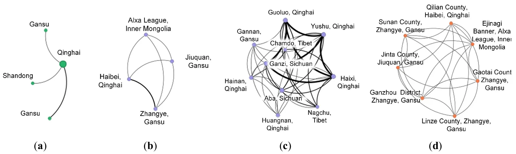 We found 13 jointly issued documents, including eleven agreements, one plan, and one opinion, which form four sub-networks of the cross-provincial collaboration network. At the provincial level (a), Qinghai collaborated with Gansu, Xinjiang, and Shandong provinces to address Qilian Mountain ecological governance, desertification control, and technical exchanges, illustrating how top-down policy directives are aligned with regional-specific ecological needs. At the municipal/prefectural-level (b,c), Haibei Prefecture collaborated with Inner Mongolia’s Alxa League and Gansu’s Jiuquan and Zhangye cities to address ecological issues. At the same time, Yushu, Haixi, and Guoluo Prefectures of Qinghao formed intricate networks with counterparts in Sichuan, Tibet, and Gansu provinces, reflecting mid-level administrative coordination on shared ecological challenges. At the county level (d), linkages such as those between Qilian County and neighboring counties in Gansu and Inner Mongolia, focused on localized issues, including water protection and enforcement of the “River-Lake Chief” system.