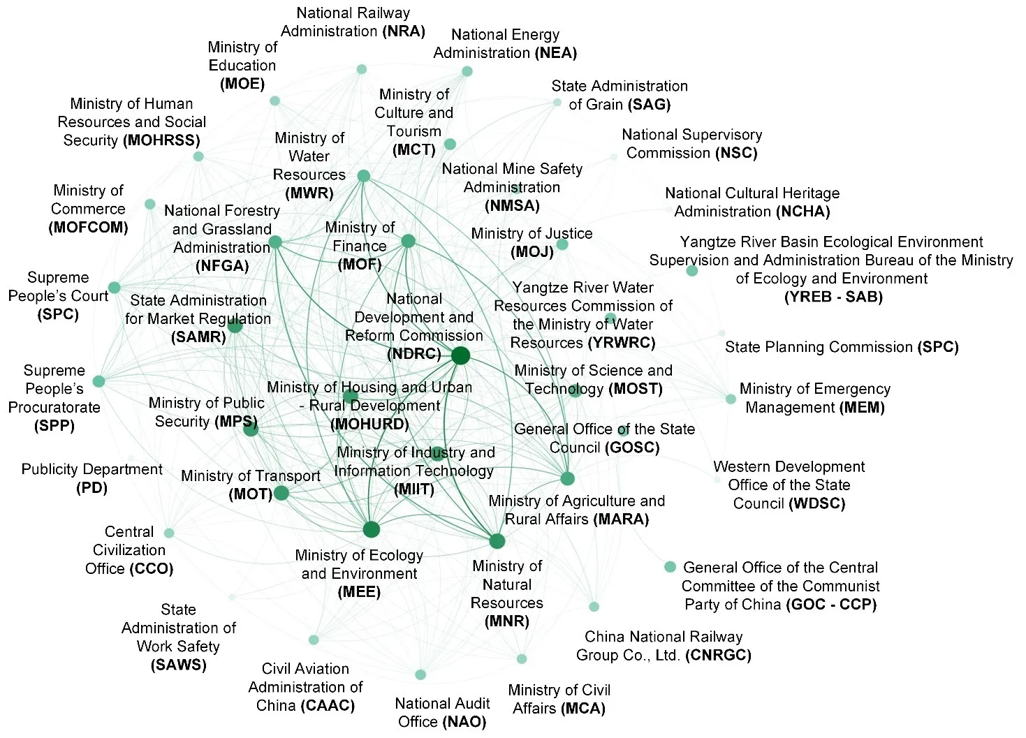All governmental entities identified as issuing entities in the documents were extracted. Entity names underwent normalization to their latest official full designations to ensure consistency across the dataset. For example, the Ministry of Environmental Protection was renamed the Ministry of Ecology and Environment in 2018, and we united the above two names as the Ministry of Ecology and Environment. Finally, a relational database was established to link documents, normalized entities, and collaboration types.