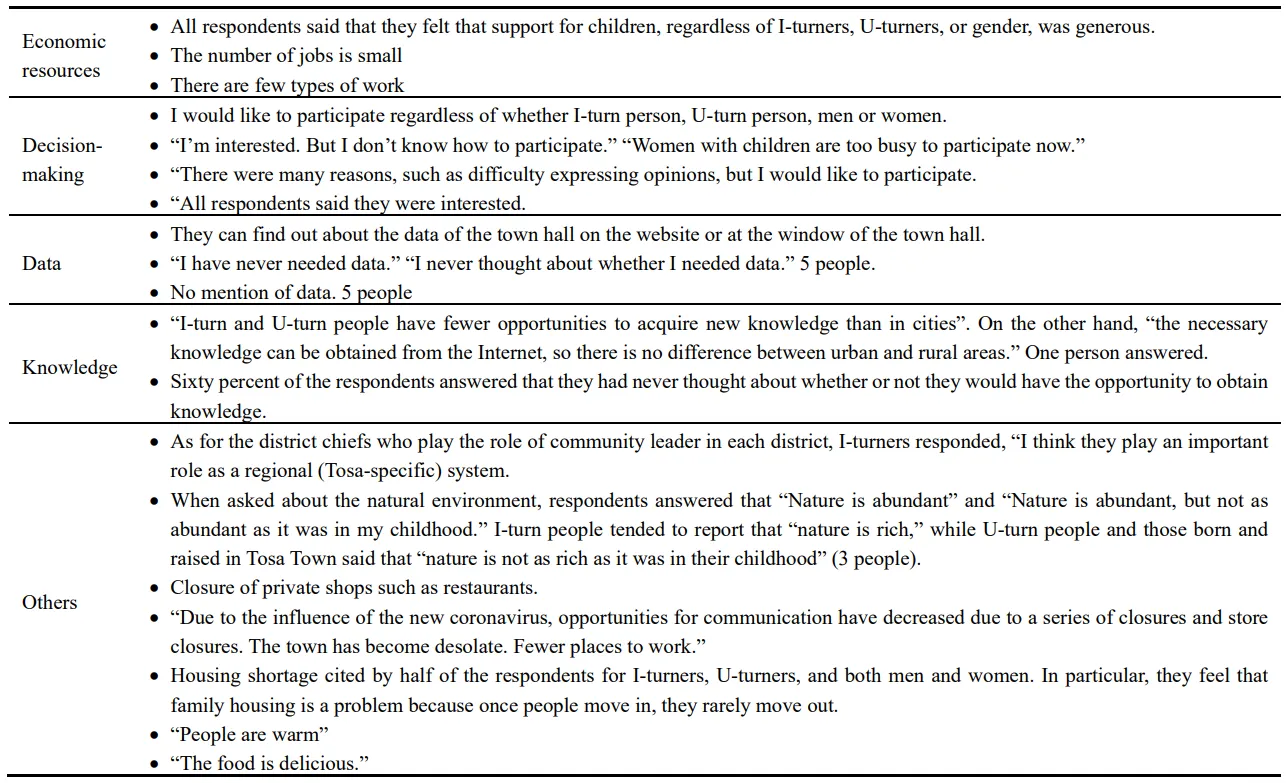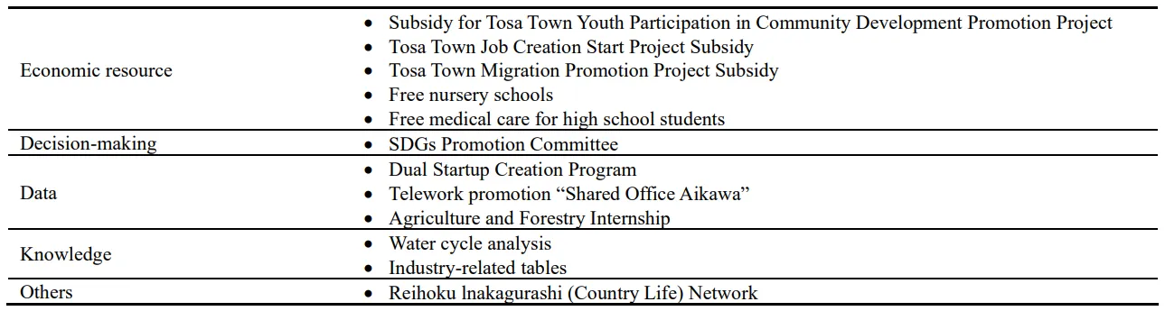As can be seen from previous research, “economic resources”, “decision making”, “data”, and “knowledge” are important. Tosa Town needs to take further measures for “decision-making,” “data,” and “knowledge” as future challenges for the town. At the same time, it is necessary to solve these issues specific to Tosa Town, such as “lack of housing,” “lack of complete hospital facilities in Tosa Town such as obstetrics and gynecology”, and “decrease in the number of restaurants and other private stores,” which were answered by the younger generation. In particular, with regard to “decision-making,” more than 80% of the respondents said, “I would like to participate.” or “interested but do not know what to do,” while there are few efforts to address these issues. Therefore, we believe that efforts to promote the participation of the younger generation in decision-making, such as the “Children’s Assembly” for junior high school students in Ichinoseki City, Iwate Prefecture, and meetings between the mayor and high school students to discuss the future of the city, will help to promote their participation.
