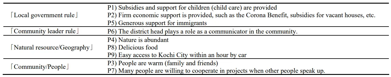 Then we classified the pull factors into “Local government rule”, “Community leaders”, “Nature resource/Geography”, and “Community/People” to Table 5. From this table, it was found that “Local government rule”, “Community leaders”, “Nature resource/Geography”, and “Community/People” play an important role in Tosa Town.