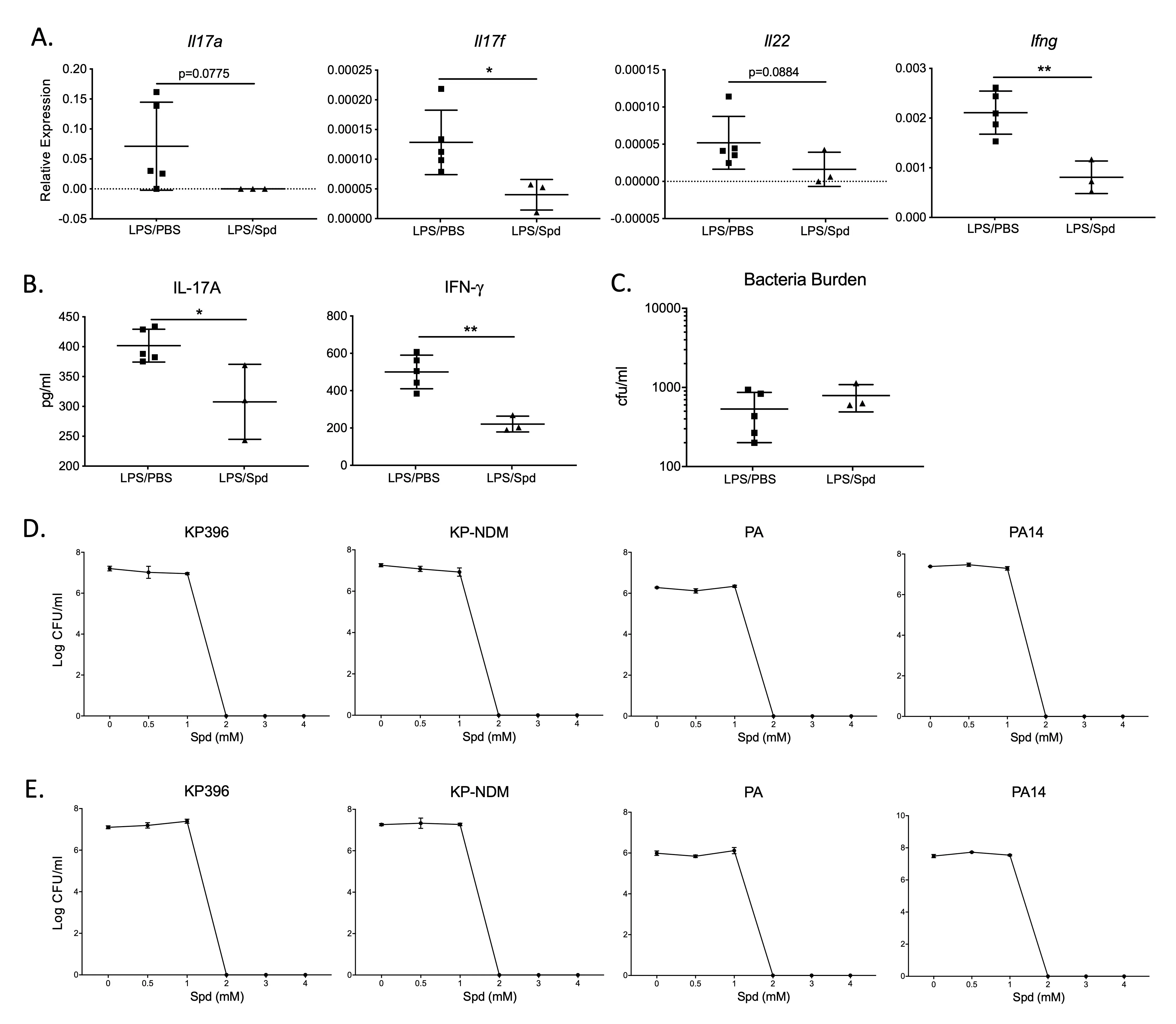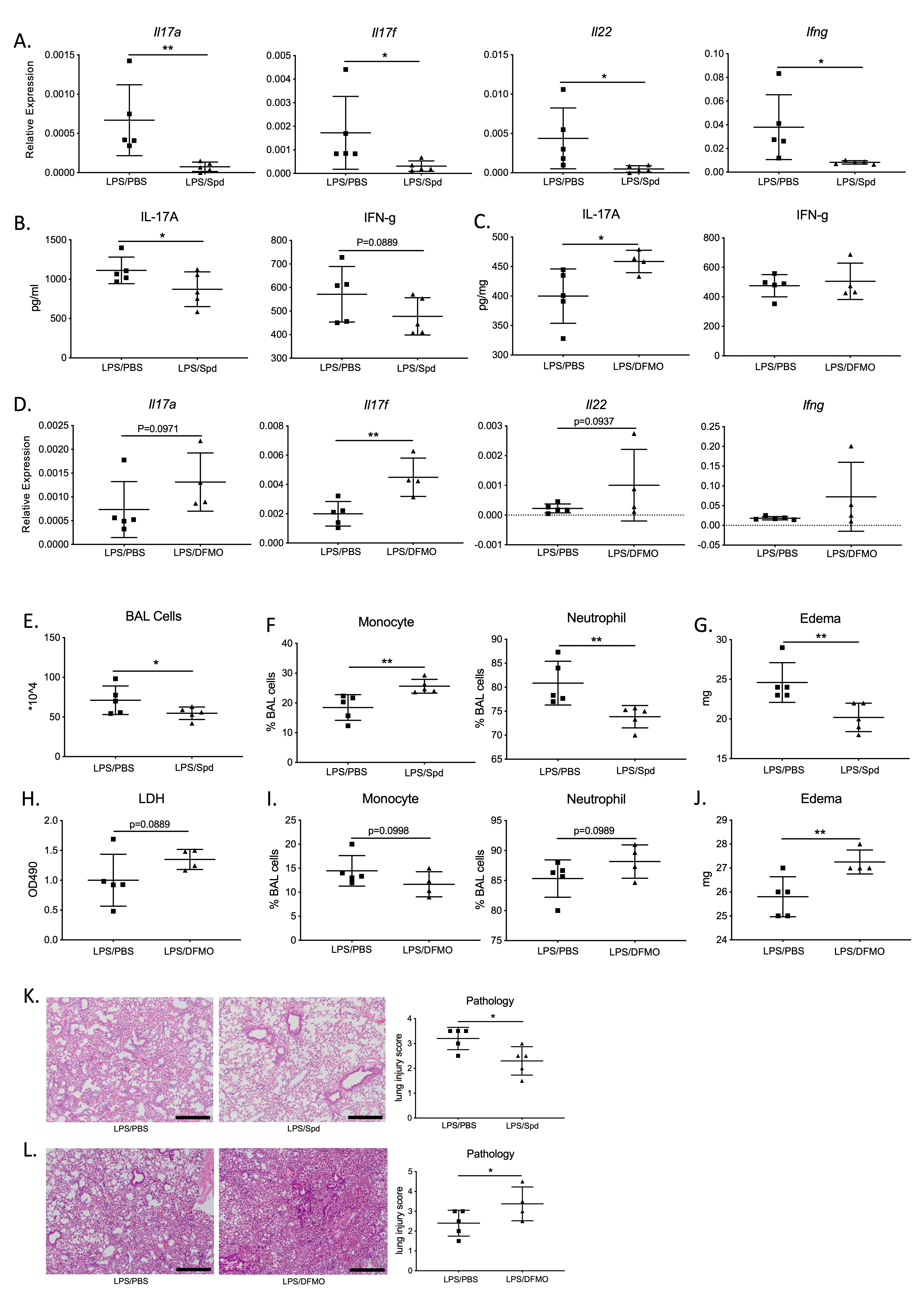 6 cfu/mouse) + spermidine treatment (5 mg/g body weight); LPS administration (5 mg/g body weight) + DFMO treatment (1.5 mg/g body weight). For spermidine treatment modules, mice were injected intraperitoneally with a spermidine solution or PBS as a control, then anesthetized with isoflurane and challenged with LPS or PA intratracheally (IT). For DFMO treatment experiments, mice were pretreated with DFMO or PBS intraperitoneally for 1 h, after which all mice were anesthetized with isoflurane and intratracheally inoculated with LPS. 18 h after inoculation, mice from all modules were euthanized with CO