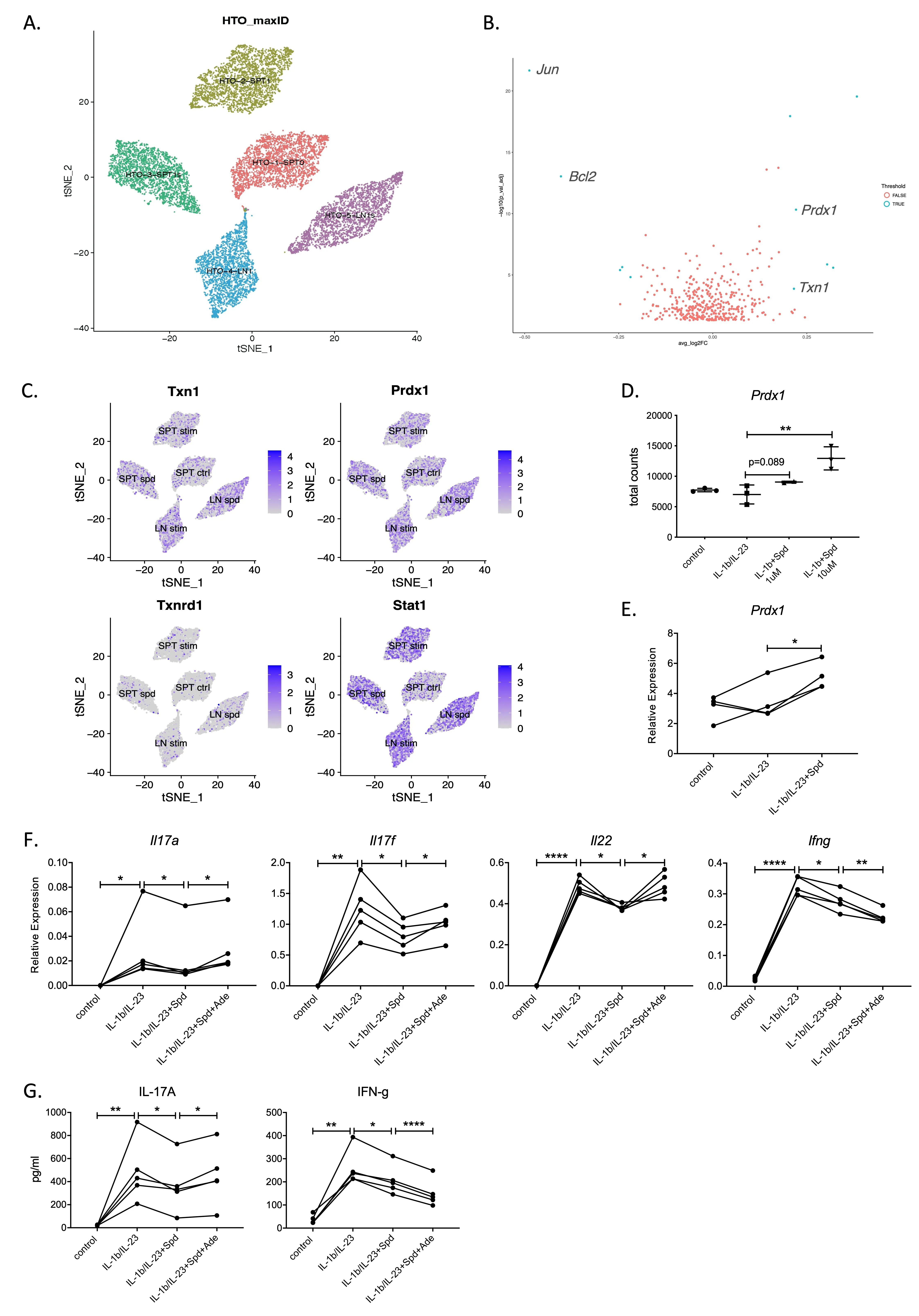18]. Similar to ScRNA-seq, Total-seq was performed following the cell hashing protocol (BioLegend). Briefly, five groups of cells were pre-labelled with mouse HashTag oligos (HTO) on cell surface: spleen T cell control group (SPT ctrl) with hashtag 1 (BioLegend, Cat# 155801); spleen T cell IL-1β/IL-23 stimulation group (SPT stim) with hashtag 2 (BioLegend, Cat# 155803); spleen T cell IL-1β/IL-23 plus spermidine treatment group (SPT sper) with hashtag 3 (BioLegend, Cat# 155805); lymph node cell IL-1β/IL-23 stimulation group (LN stim) with hashtag 4 (BioLegend, Cat# 155807); lymph node cell IL-1β/IL-23 plus spermidine treatment group (LN sper) with hashtag 5 (BioLegend, Cat# 155809). We targeted 4000 cells per sample, totalling 20,000 cells. The five cell populations were mixed and barcoded, and barcoded cDNA was synthesized via reverse transcription. Further cDNA libraries were constructed by cDNA amplification. HTO-derived cDNAs (<180 bp) and mRNA-derived cDNAs (>300 bp) were separated using a magnetic beads selection methodology. An HTO sequencing library was generated for sequencing, followed by another round of cDNA amplification. The mRNA-derived cDNA library was constructed following the conventional scRNA-seq protocol. The HTO library and DNA library were then sequenced on an Illumina HiSeq sequencer (MedGenome, Inc.; Foster City, CA, USA). Sequencing data were initially analyzed using Cell Ranger (10× Genomics) and downstream analysis was performed using R. The R package Seurat (v5.0.0) was used to perform HTO demultiplexing, doublet, negative, and low quality cell filtration, as well as unsupervised clustering. Differential gene expression was performed using the Wilcoxon method and with the “findmarkers” function in Seurat.
