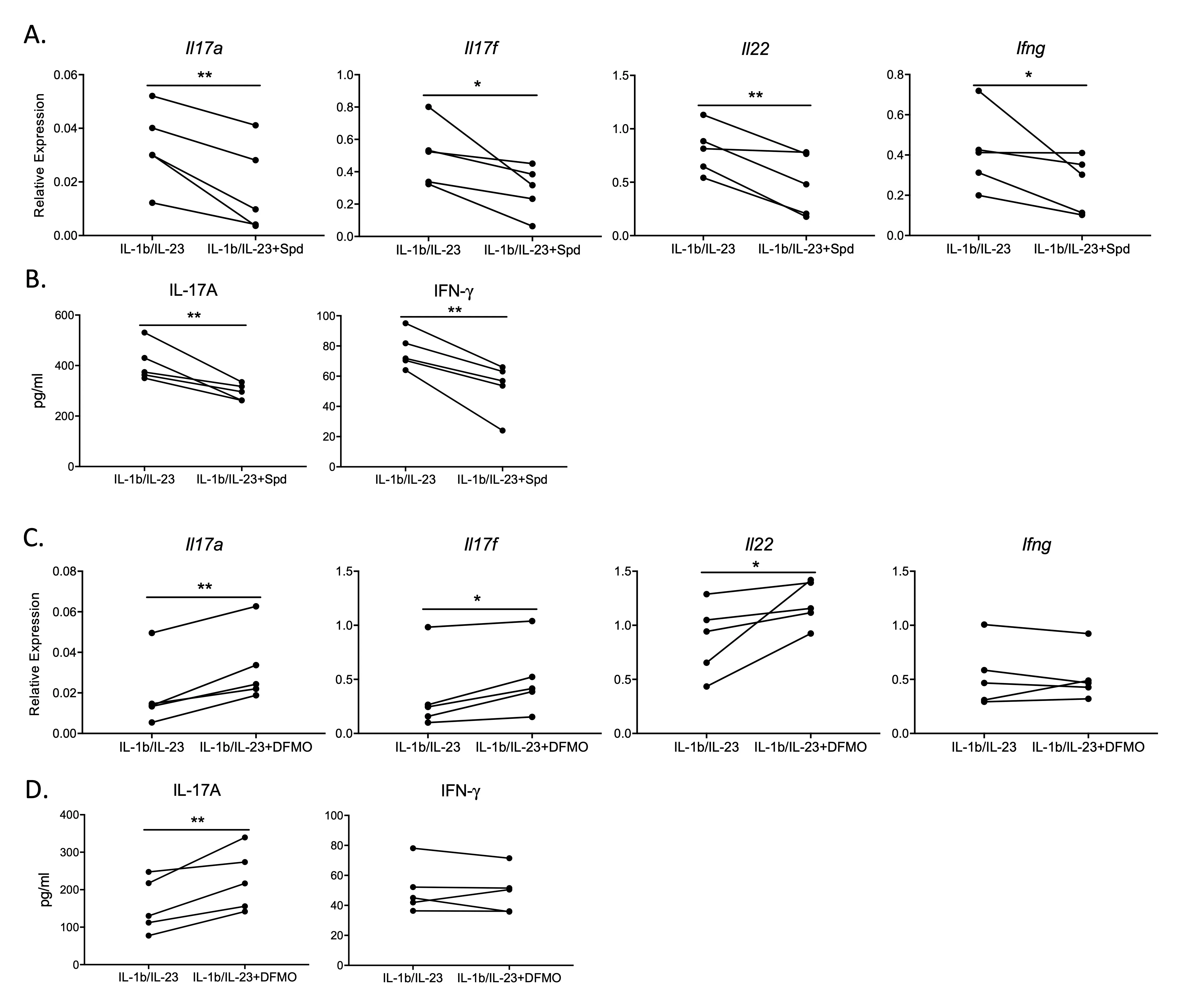 Upon administration of spermidine, both the gene expression and protein levels of Th17/IL-17 cytokine products were downregulated in T cells stimulated with IL-1β/IL-23 (