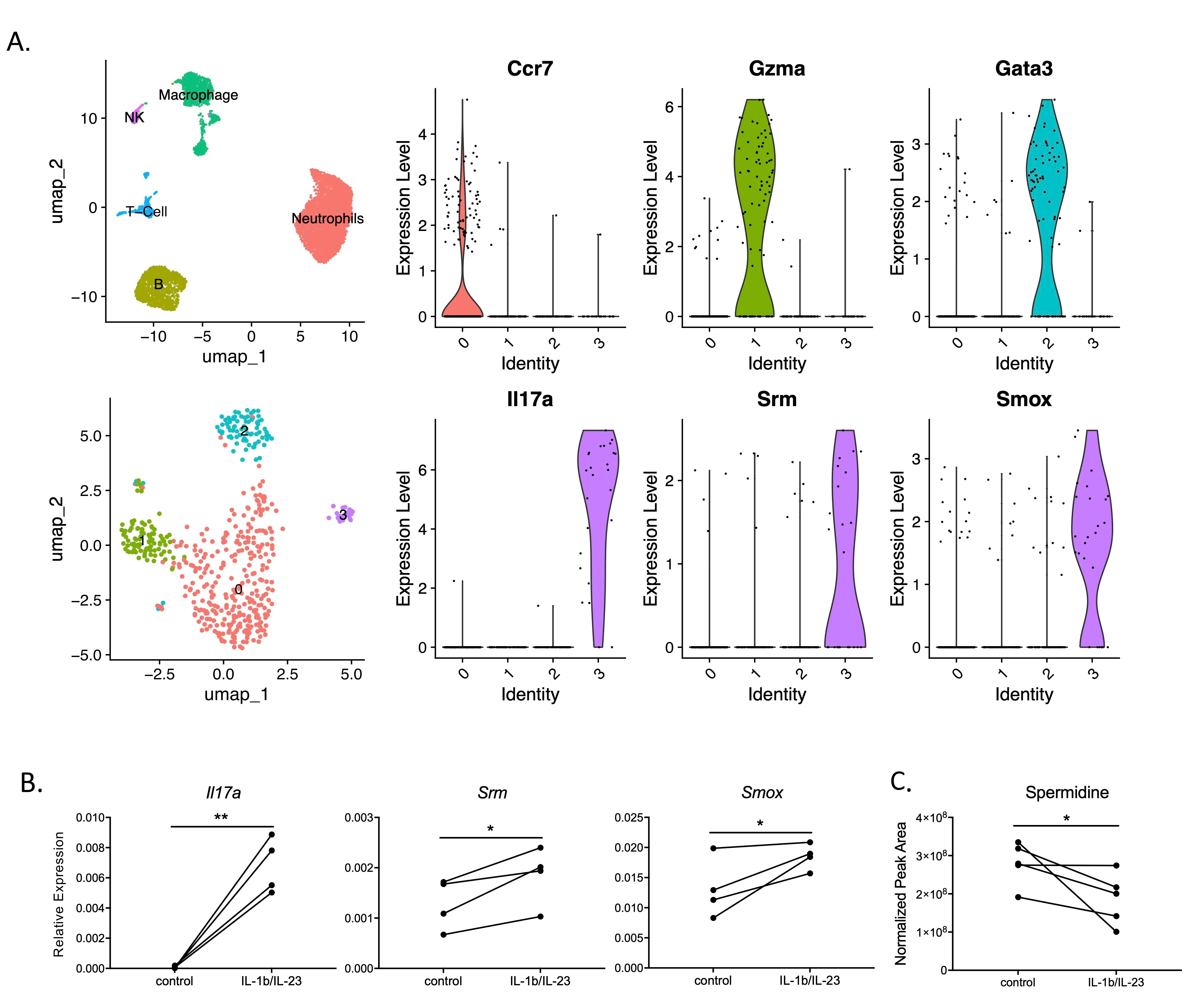 . Polyamine metabolism is involved in IL-17 production. (<strong>A</strong>) Thioglycollate-induced mouse peritoneal lavage cells were collected and stimulated with IL-1b/IL-23, and scRNA data confirmed IL-17-producing cells had high <em>Srm</em> and <em>Smox</em> expression. (<strong>B</strong>,<strong>C</strong>) Spleen T cells were stimulated with mouse IL-1b+IL-23 overnight, (<strong>B</strong>) <em>Il17a</em>, <em>Srm</em> and <em>Smox</em> were highly induced, gene expression relative to <em>Gapdh </em>(graphs displayed in panel B are representative ones from four repeated experiments, N = 2–4 in each experiment); (<strong>C</strong>) Polyamine in the cytoplasm of T cells were measured by HPLC system. <sup>∗</sup><em>p</em> < 0.05, <sup>∗∗</sup> <em>p</em> < 0.01 by paired Student <em>t</em>-test.