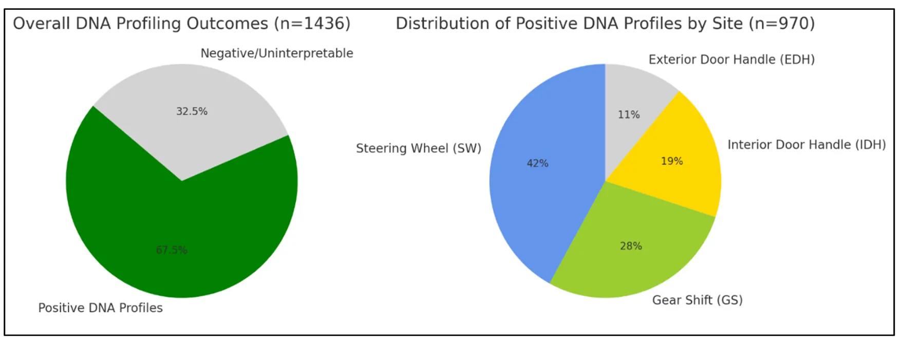 1769 Touch DNA samples were collected from 359 vehicles involved in hit-and-run incidents between 2020 and 2023. Of these, 1436 samples were obtained from four pre-selected vehicle surfaces of forensic interest: the steering wheel (SW), gear shift (GS), interior door handle (IDH), and exterior door handle (EDH). Upon completion of DNA profiling, 970 of the samples (67.5%) yielded interpretable DNA profiles. A result was considered positive if the DNA profile exhibited either homozygous or heterozygous alleles across at least eight of the 13 CODIS core loci and met the statistical rarity threshold comparable to a single match within the NDIS database.
