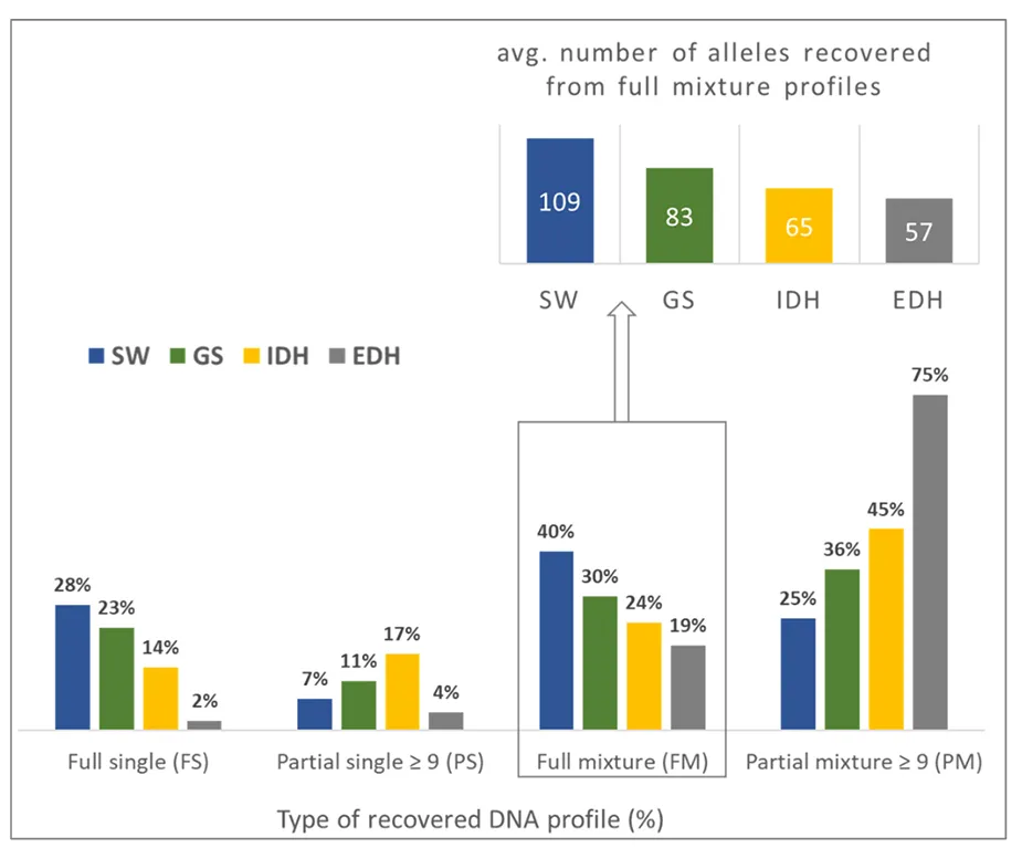 . Comparative analysis of Touch DNA profile types obtained from 970 positive samples collected across four primary vehicle sampling sites: steering wheel (SW), gear shift (GS), interior door handle (IDH), and exterior door handle (EDH), from 359 hit-and-run case vehicles between 2020 and 2023. DNA profiles were categorized as full single (FS), full mixture (FM), partial single (PS), or partial mixture (PM), with partial profiles defined as those containing alleles in at least nine loci. The figure also presents the average number of alleles recovered from full mixed (FM) profiles by site: SW (109), GS (83), IDH (65), and EDH (57). The results indicate that the steering wheel and gear shift produced more complete and information-rich profiles. At the same time, the interior and exterior door handles yielded comparatively fewer alleles, suggesting lower evidentiary value.