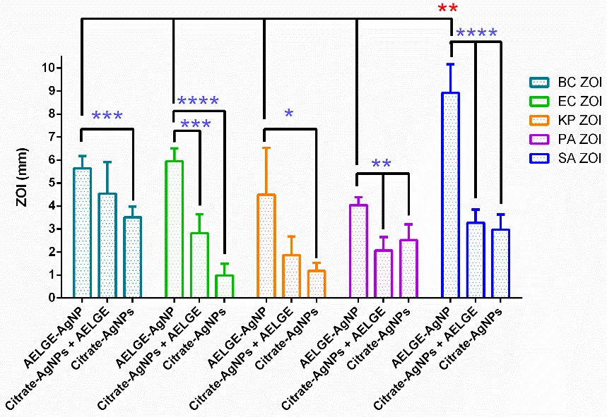 P. aeruginosa). An unpaired t-test was performed to assess the superiority of AELGE-AgNPs over citrate-AgNPs in terms of the overall antibacterial efficacy. (Zones of inhibition (ZOIs) were measured in millimeters (mm) using ImageJ software, excluding the 6 mm diameter of the disc. Each condition was tested in quadruplicate (