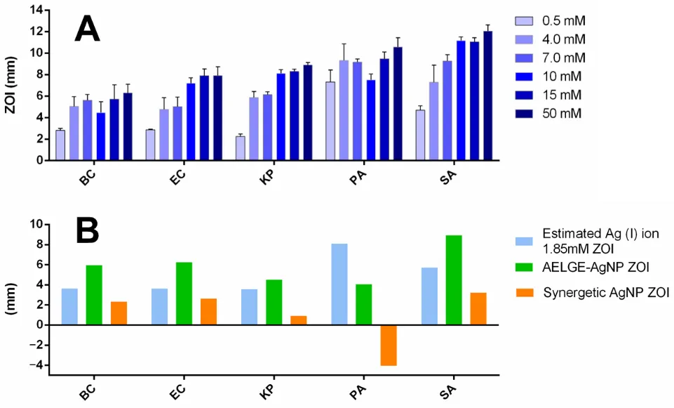 Staphylococcus aureus USA300) was inoculated into 5.0 mL of Luria Broth (LB) medium and incubated overnight at 37 °C. Subsequently, a sterile spreader spread 50 µL of the overnight LB culture evenly onto Mueller-Hinton agar plates. Whatman AA discs (6 mm in diameter) were placed on the inoculated agar surfaces. A volume of 12 µL of the AELGE-AgNP solution was applied to each disc, and the plates were incubated for 24 h at 37 °C in a Thermo Scientific™ Heracell™ 150i incubator. Zones of inhibition (ZOIs) were measured in millimeters (mm) in diameter, excluding the 6 mm diameter of the disc. Areas of the zones of inhibition (AZOIs) were also calculated based on the ZOI measurements. For comparison, citrate-AgNPs were tested using the same disk diffusion method. Additionally, citrate-AgNPs + AELGE group was also tested (mixing 100 µL of AELGE (0.37%) with 900 µL of citrate-AgNP solution at 2.0 mM of Ag