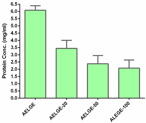 −1 with 16 scans. The presence and concentration of proteins in AELGE were confirmed and determined using the Pierce™ BCA Protein Assay Kit. For SDS-PAGE, AELGE (2.0%, 100 μL) was mixed with 100 μL of SDS-PAGE buffer and 7.0 μL of 2-Mercaptoethanol (BME, 14.7 M). The mixture was then heated at 90 °C for 10 min. Proteins in AELGE were separated in Mini-PROTEAN