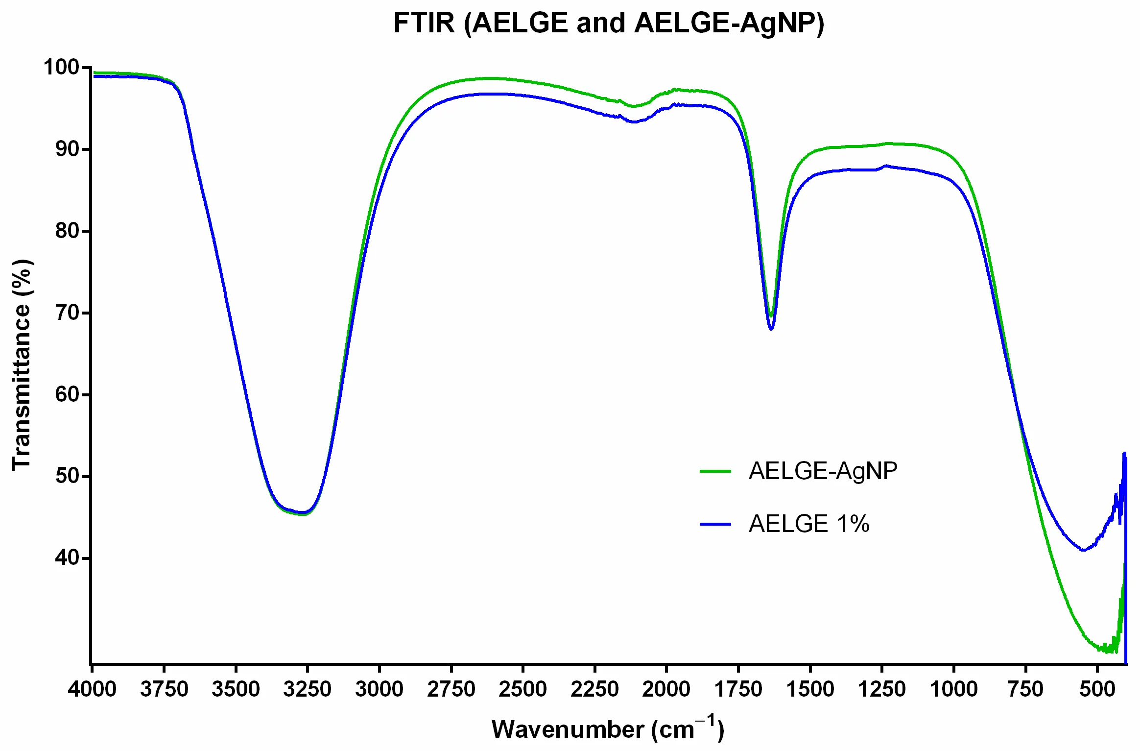 . FTIR of AELGE and AELGE-AgNPs: Two main peaks indicate that AELGE and AELGE-AgNPs contain compounds with NH/OH groups (OH stretching of water plus Amide A band) and C=O groups (water bending plus Amide I band). These peaks suggest that AELGE and the capping agents of AELGE-AgNPs primarily comprise similar polypeptides and other water-soluble biomolecules, including phenols, alkaloids, and organic acids. Notably, the only substantial difference between the FTIR spectra of AELGE and AELGE-AgNPs was detected in the region below 750 cm<sup>−1</sup>. This indicates that AELGE proteins and polypeptides underwent conformational changes in their structure while reducing Ag<sup>+</sup> ions to form AELGE-AgNPs.